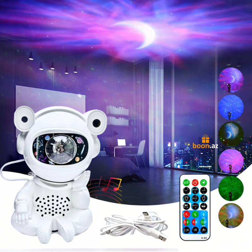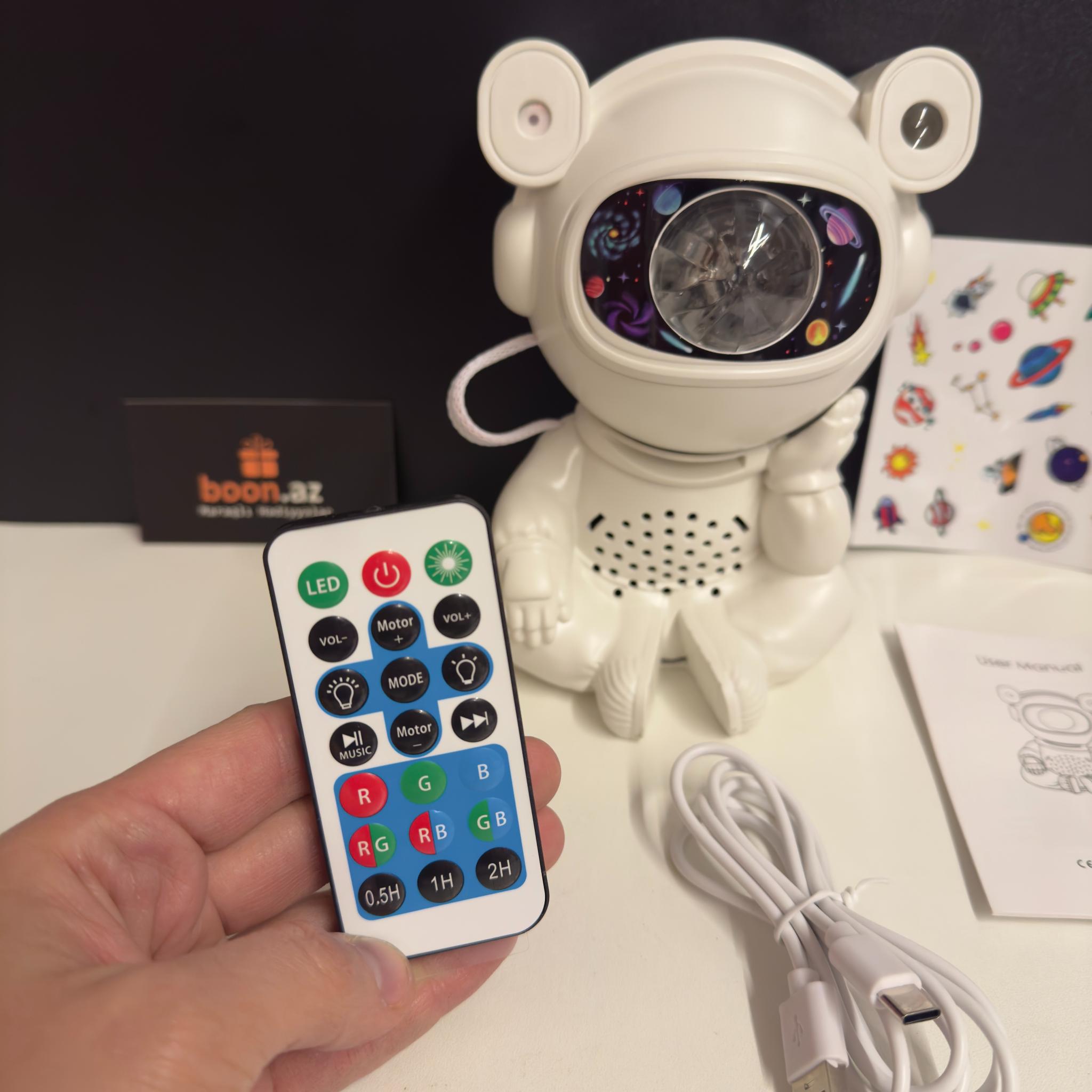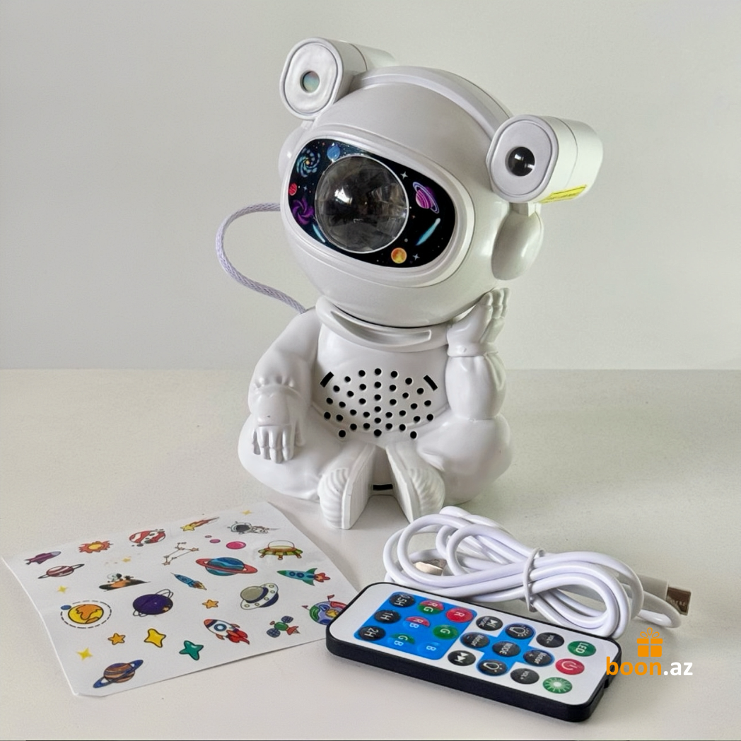 Создайте в комнате атмосферу космического спокойствия с многофункциональным проектором в виде милого астро-медвежонка. Устройство проецирует на потолок яркие неоновые эффекты, звёзды, луну и туманности, наполняя пространство мягким светом и создавая идеальные условия для отдыха, сна или уютных вечеров.