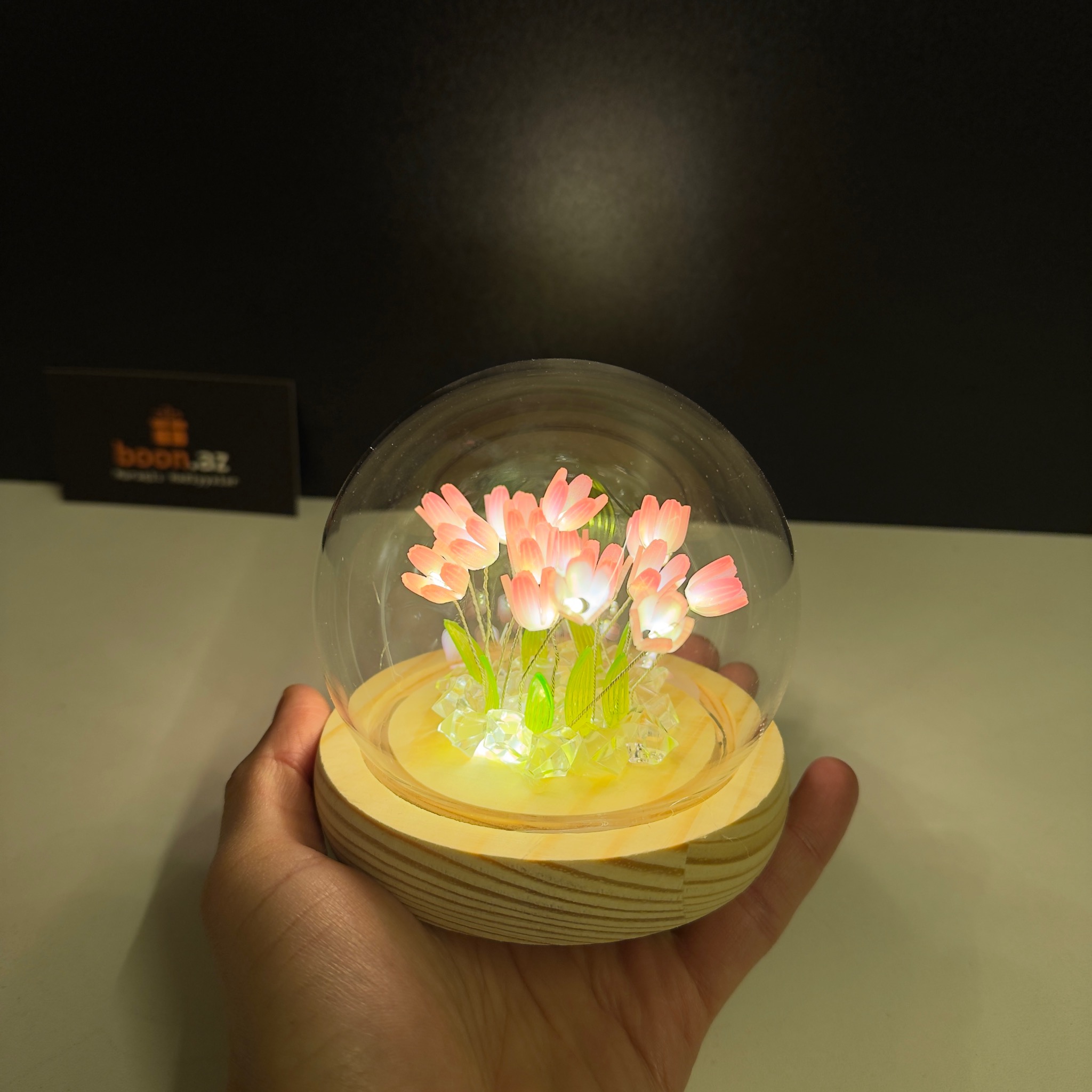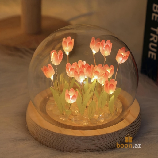 Стильный интерьерный светильник с нежными светящимися тюльпанами под прозрачным стеклянным куполом. Мягкая LED-подсветка создаёт уютную атмосферу. Деревянное основание с питанием от 3 батареек позволяет размещать светильник без проводов. Отлично подойдёт для декора и в качестве подарка.