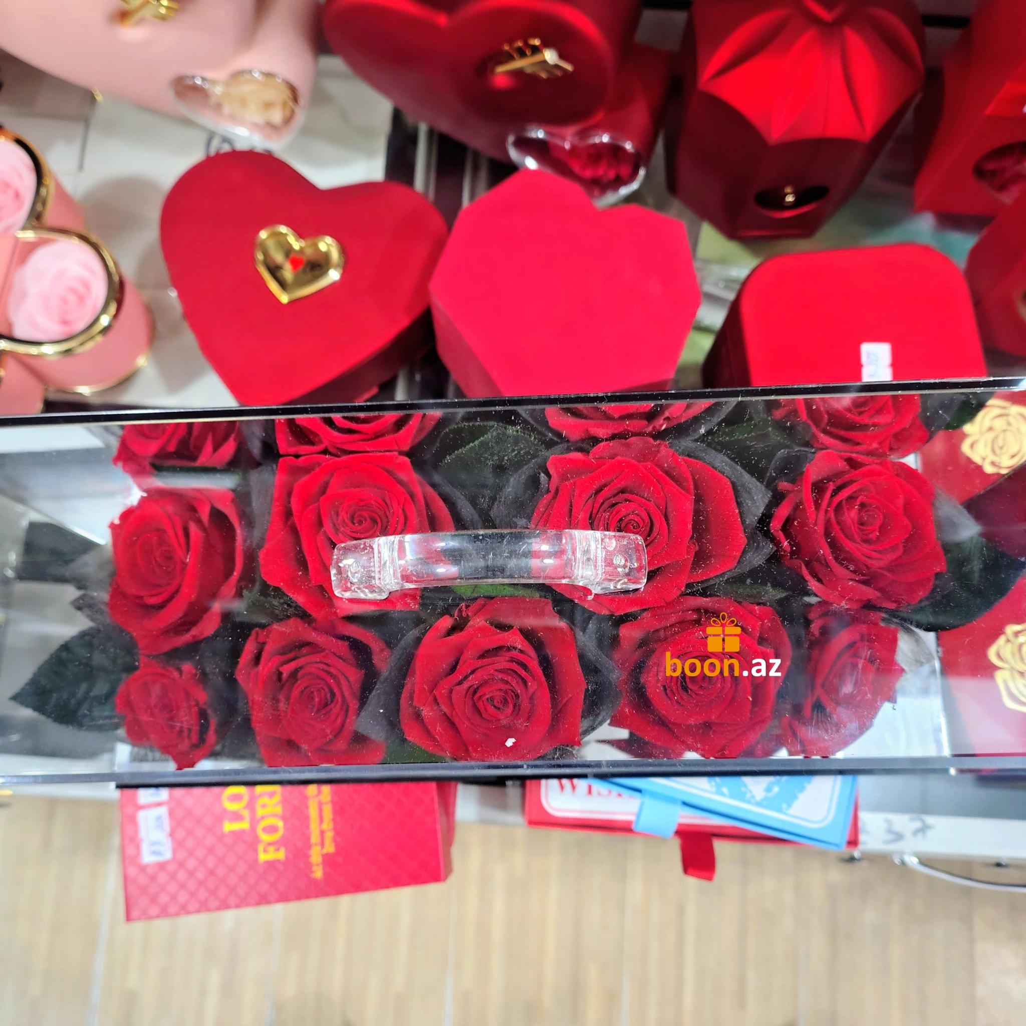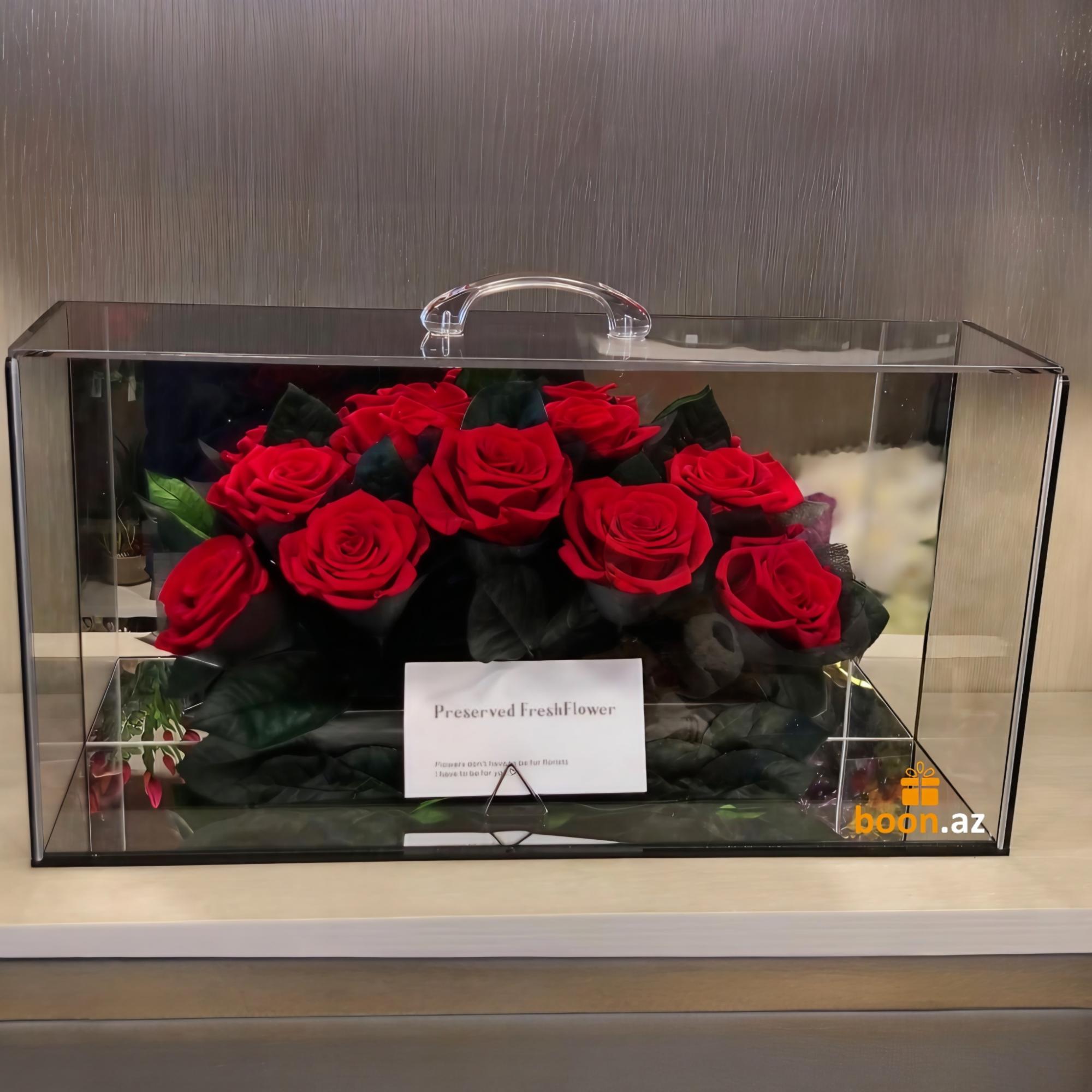 Стабилизированные розы проходят специальную обработку, благодаря которой они сохраняют свежий вид, форму и насыщенный цвет без полива и ухода. Прозрачный акриловый бокс с удобной ручкой надежно защищает композицию от пыли и внешних воздействий, подчеркивая премиальный внешний вид изделия.