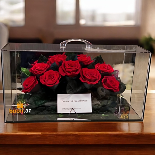 Стабилизированные розы проходят специальную обработку, благодаря которой они сохраняют свежий вид, форму и насыщенный цвет без полива и ухода. Прозрачный акриловый бокс с удобной ручкой надежно защищает композицию от пыли и внешних воздействий, подчеркивая премиальный внешний вид изделия.