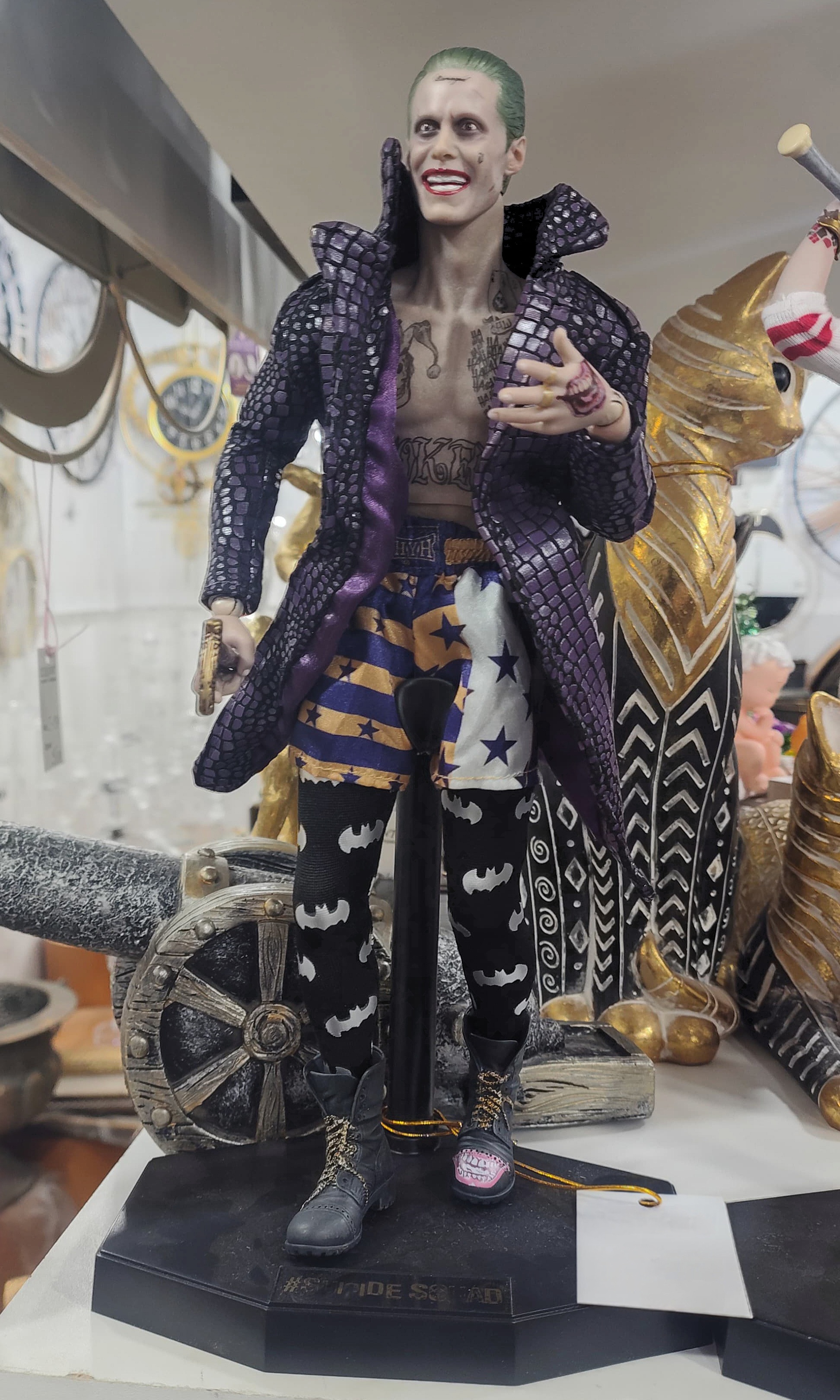 Коллекционная фигурка Джокера Suicide Squad The Joker максимально достоверно живописует обновленный образ в исполнении Джареда Лето, включая безбашенный прикид, позолоченные цепи и прочие цацки.
