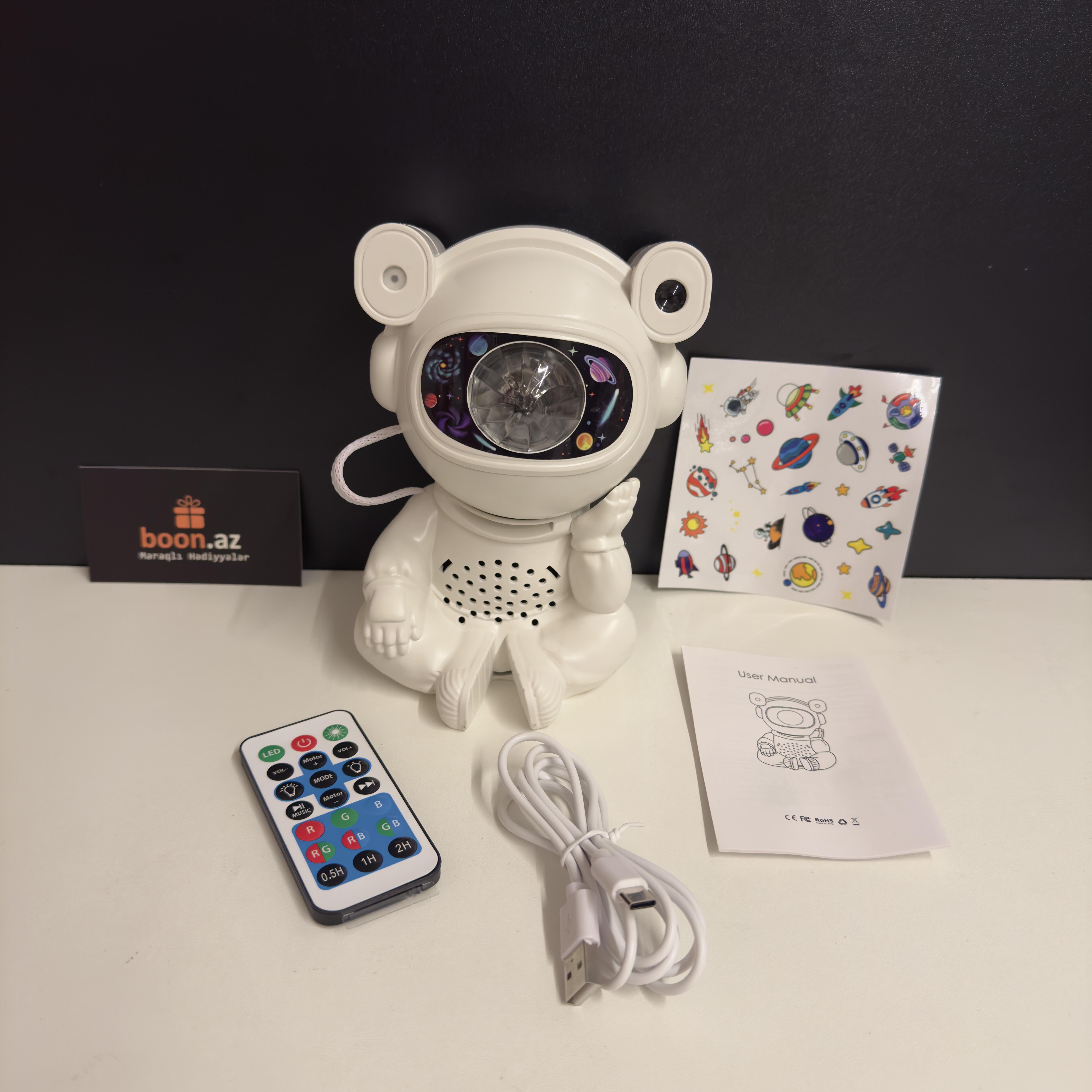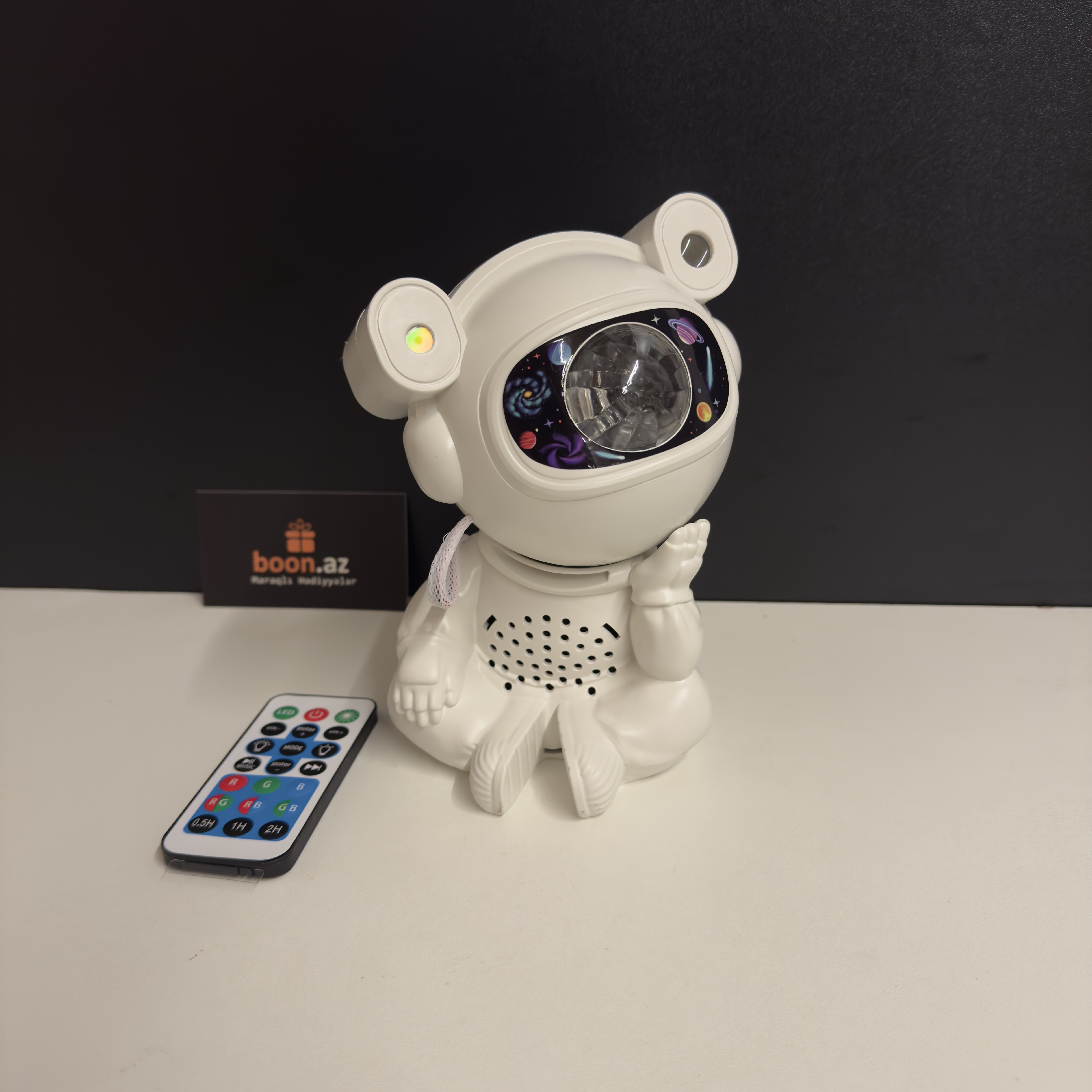 Создайте в комнате атмосферу космического спокойствия с многофункциональным проектором в виде милого астро-медвежонка. Устройство проецирует на потолок яркие неоновые эффекты, звёзды, луну и туманности, наполняя пространство мягким светом и создавая идеальные условия для отдыха, сна или уютных вечеров.