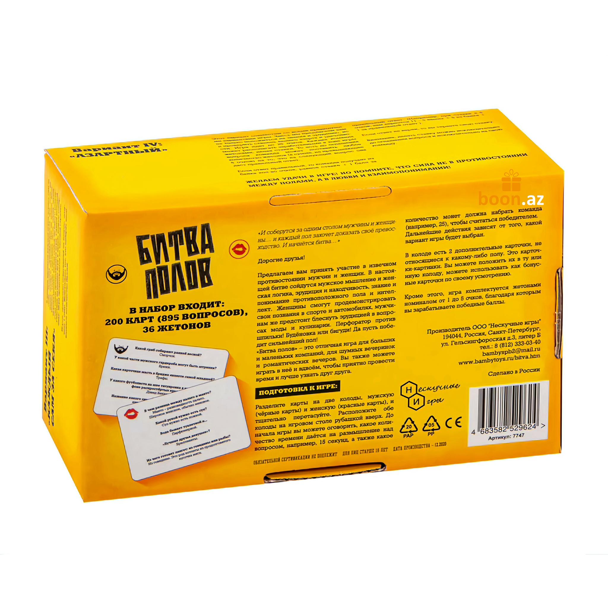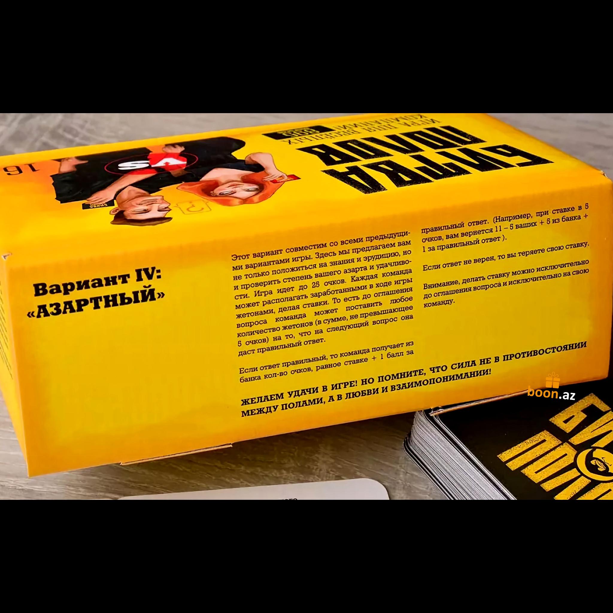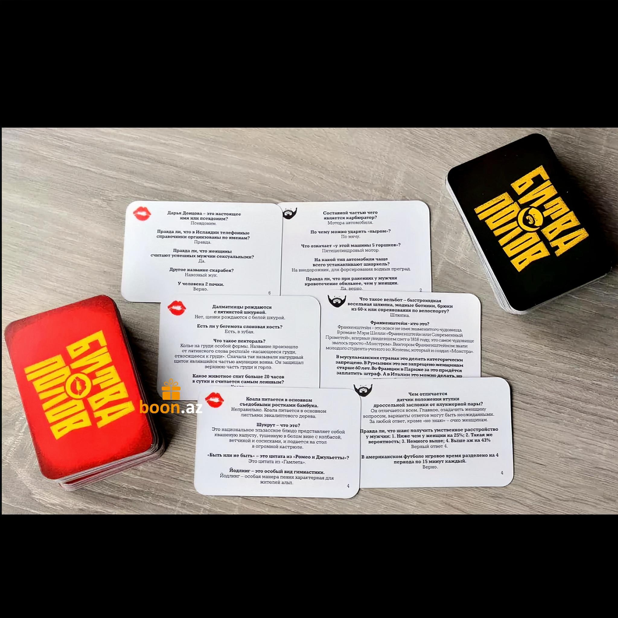 Обе команды по очереди тянут карточки с вопросами и зачитывают их соперникам. За правильный ответ команда получает то количество очков, которое указано на карточке. Те, кто дал неверный ответ на вопрос, передают ход и получают ноль очков. Играть в "Битву Полов" можно вдвоем - это отличное парное развлечение! С одной стороны, вы сможете выяснить отношения с любимой половиной, а с другой - это прекрасный способ определить, кто на этот раз выгуляет пса, вынесет мусор или помоет посуду. Так или иначе, количество человек, вовлеченных в игру, не имеет никакого значения.