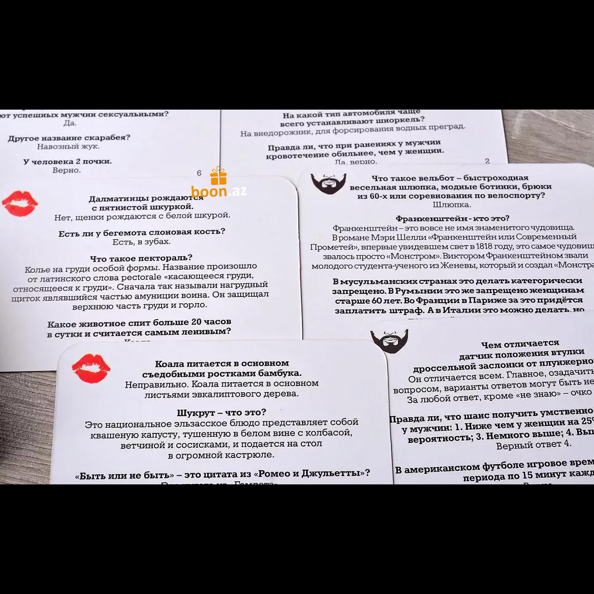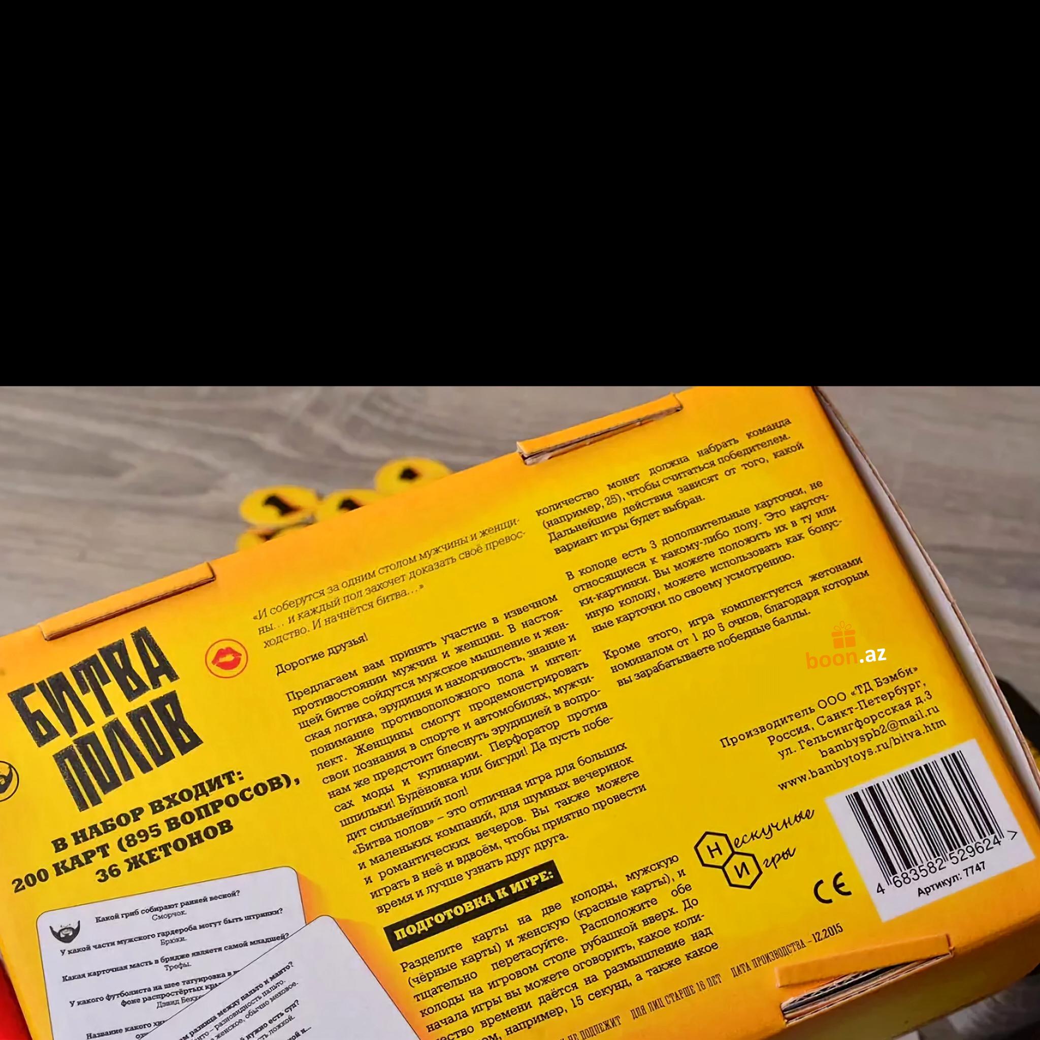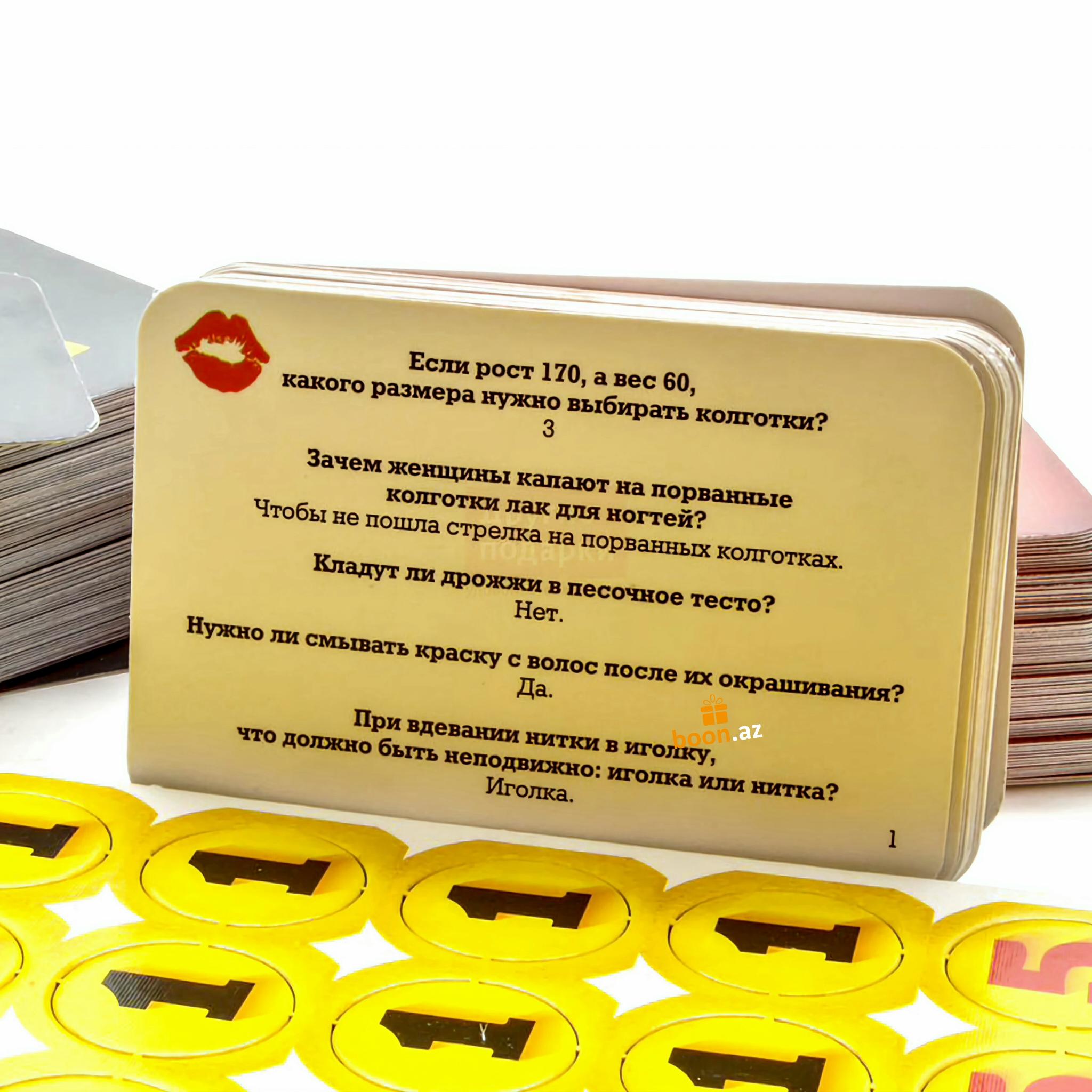 Обе команды по очереди тянут карточки с вопросами и зачитывают их соперникам. За правильный ответ команда получает то количество очков, которое указано на карточке. Те, кто дал неверный ответ на вопрос, передают ход и получают ноль очков. Играть в "Битву Полов" можно вдвоем - это отличное парное развлечение! С одной стороны, вы сможете выяснить отношения с любимой половиной, а с другой - это прекрасный способ определить, кто на этот раз выгуляет пса, вынесет мусор или помоет посуду. Так или иначе, количество человек, вовлеченных в игру, не имеет никакого значения.