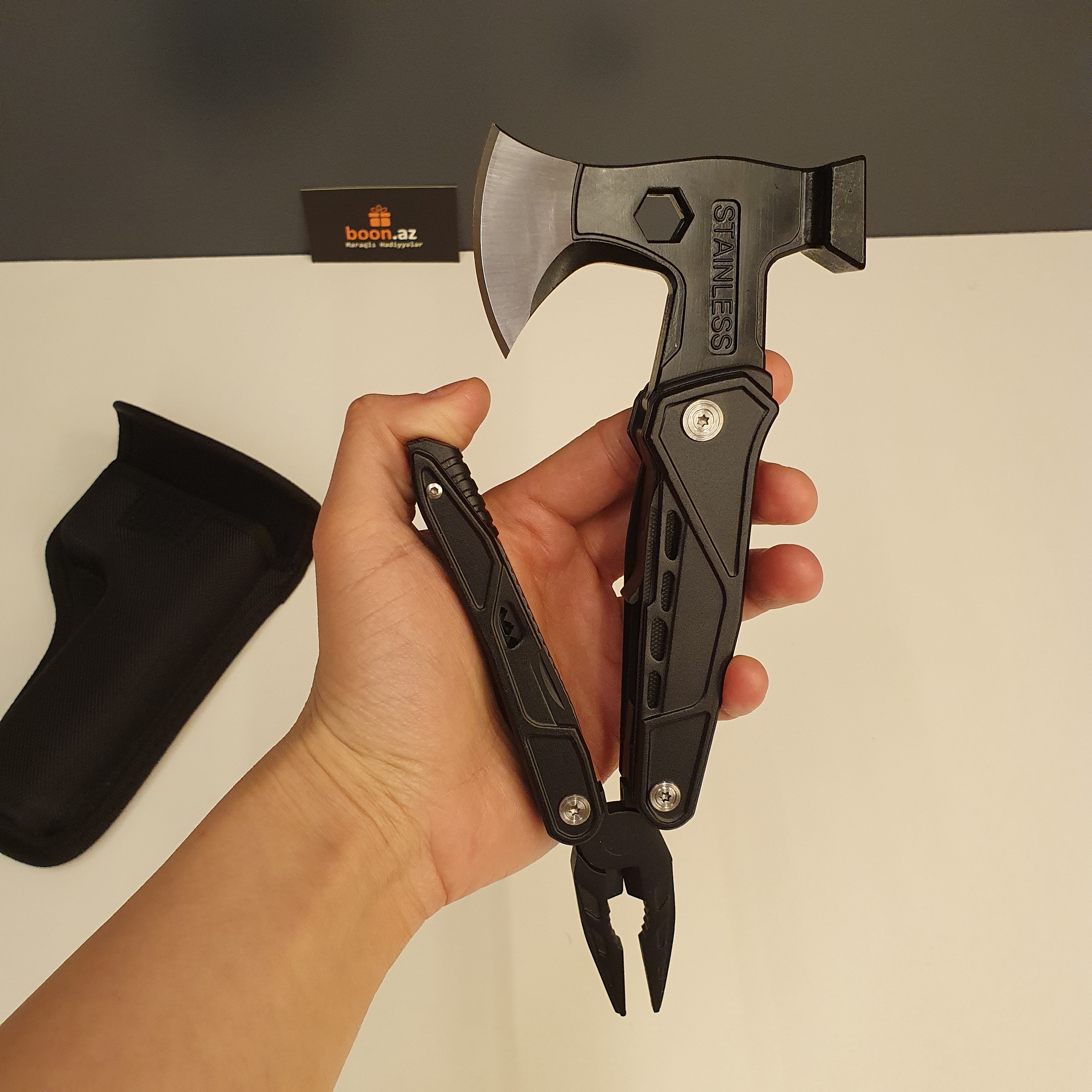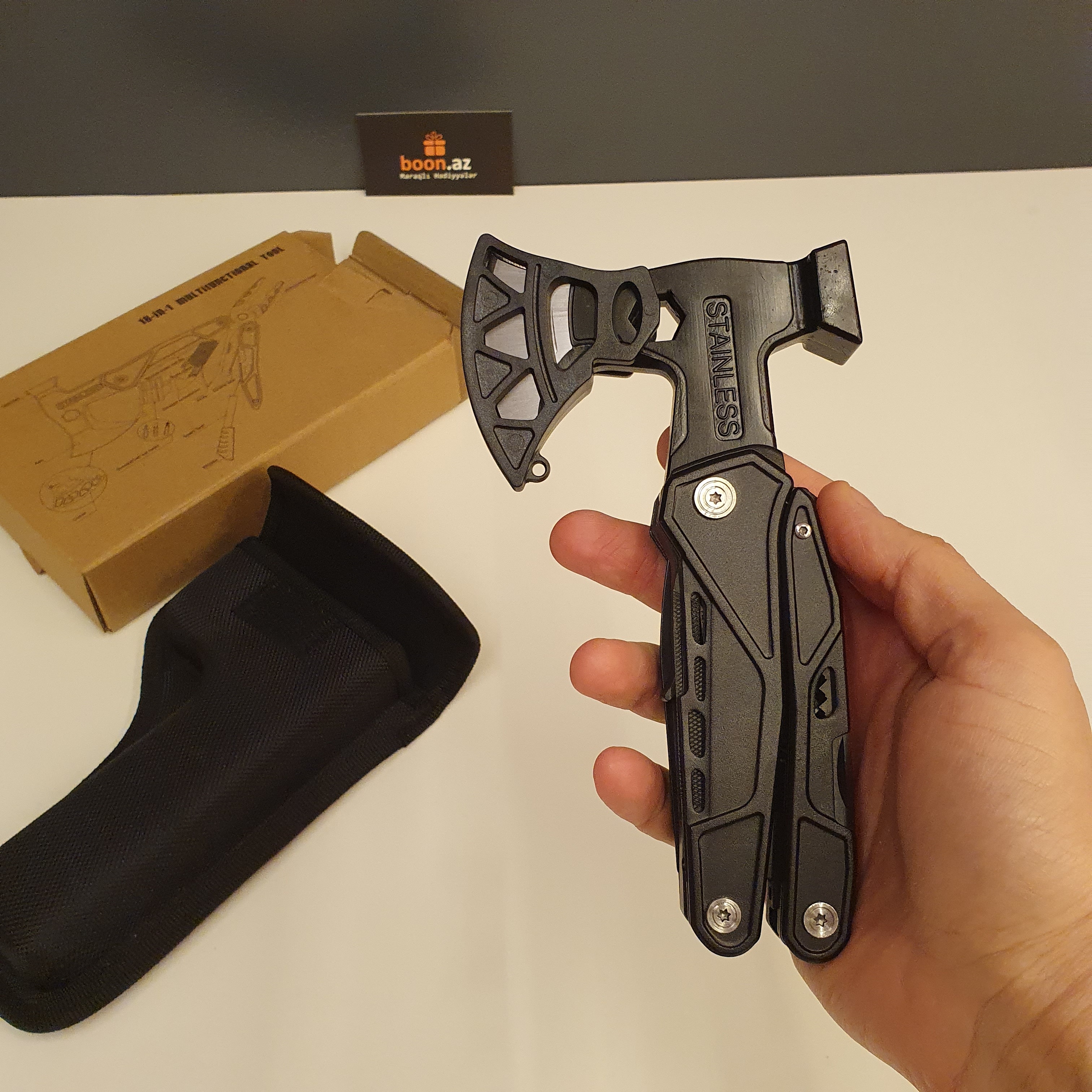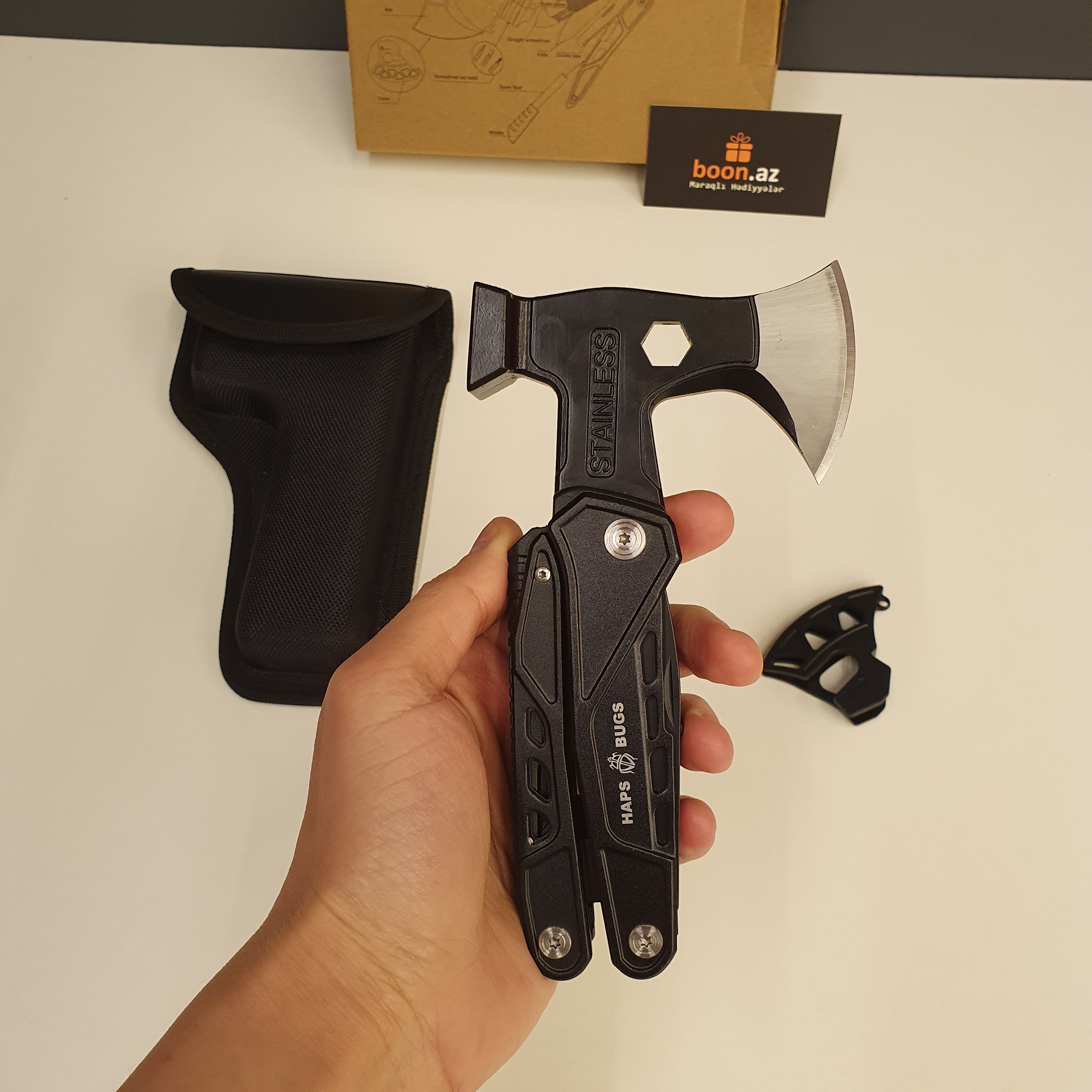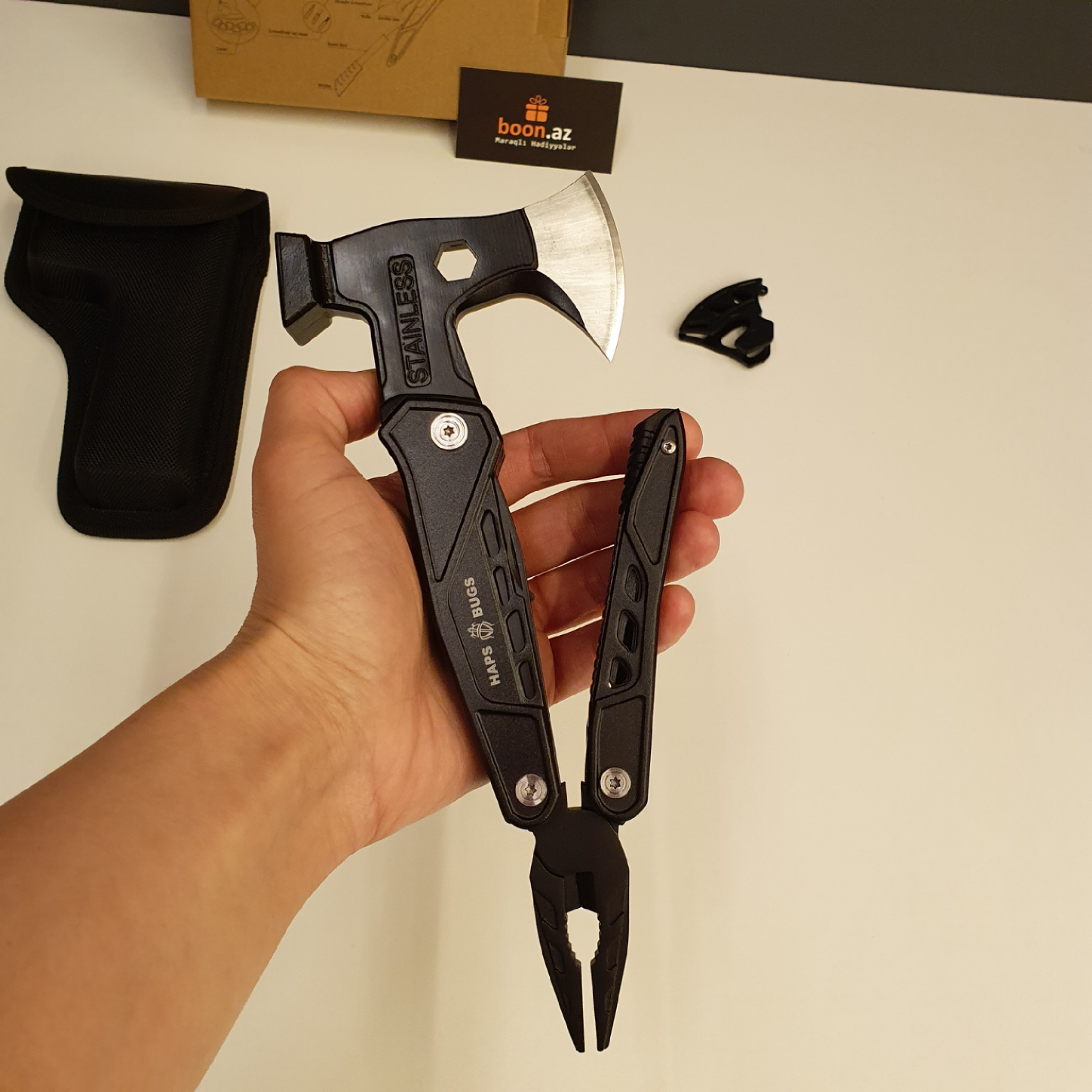 Универсальный мультитул топор-молоток включает в себя плоскогубцы, пилу и острый нож. Напильник и три отвертки - плоская (щелевая), крестовые (3 биты). Маленький консервный нож, открывашку для бутылок. Огниво и свисток. Магнитный битодержатель позволит сохранить ваши биты в целости и не потерять их. Рукоятка топора походного изготовлена из крашенного алюминия, а эргономической форма ручки идеальна для удобного и безопасного удержания в процессе работы. Топор подойдет для туризма и походов. Мультитул туристический станет незаменимым помощником во время охоты и рыбалки. Лучший помощник для работы в саду, на даче и любых бытовых нужд. Мультитул универсальный поможет при срочном ремонте автомобиля. Миниатюрный топорик с плоскогубцами можно легко разместить в рюкзаке с другими аксессуарами, мультитул не займет много места, но выручит в походе не один раз. Мультитул имеет стильный дизайн, практичен. В подарок в комплект входит чехол - сумка для удобства транспортировки, прикрепления к ремню на пояс и безопасности при ношении снаряжения. Так же безопасность носки топорика универсального обеспечивает предохранительный бокс для лезвия. Военный мультиинструмент с легкостью можно разместить в подсумок, бардачок авто или велосипеда или просто положить в ящик с инструментами для машины. Мультитул универсальный топор-молот с плоскогубцами станет отличным подарком для настоящих мужчин на Новый год, 23 февраля и день рождения. Топор для рыбалки, охоты идеально подойдет любителям этих видов развлечений. Так же раскладной топор будет незаменим на кухне во время рубки мяса и костей. Мультитул тактический относится к категории подарки мужчинам, сувениры и экипировка. Можно использовать как ледоруб, стеклобой и стропорез в экстремальных ситуациях. Преподнесите оригинальный подарок папе, мужу и брату. Любимому мужчине, дедушке и сыну. Коллеге, деду и охотнику, пожарному. Упаковано в коробку.
