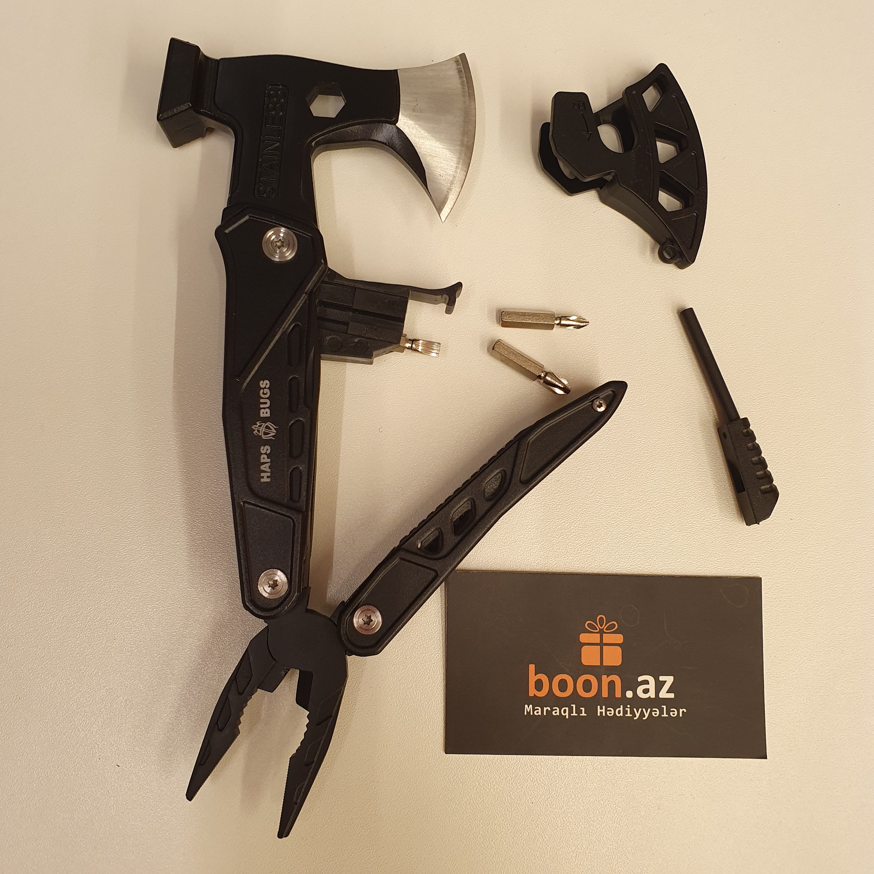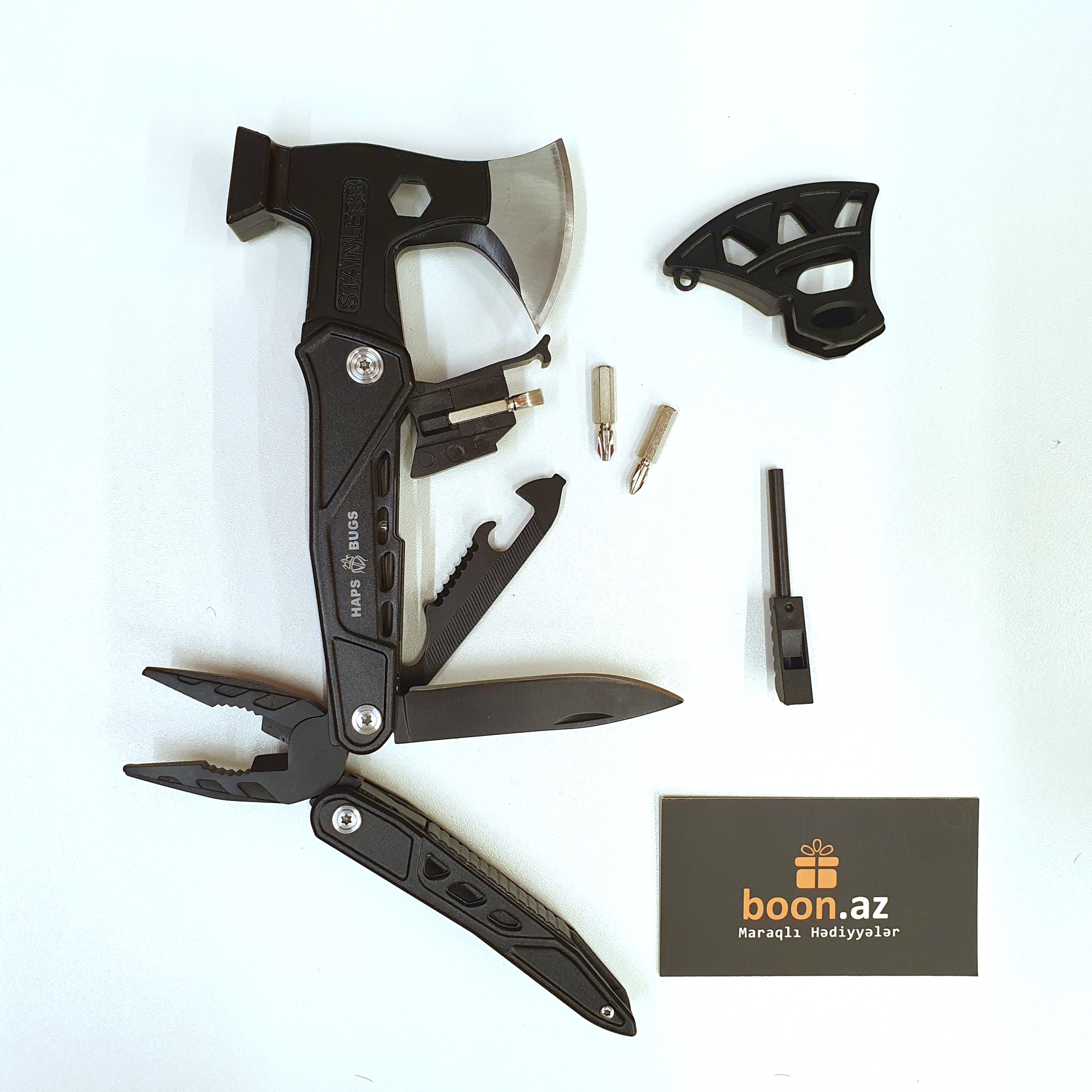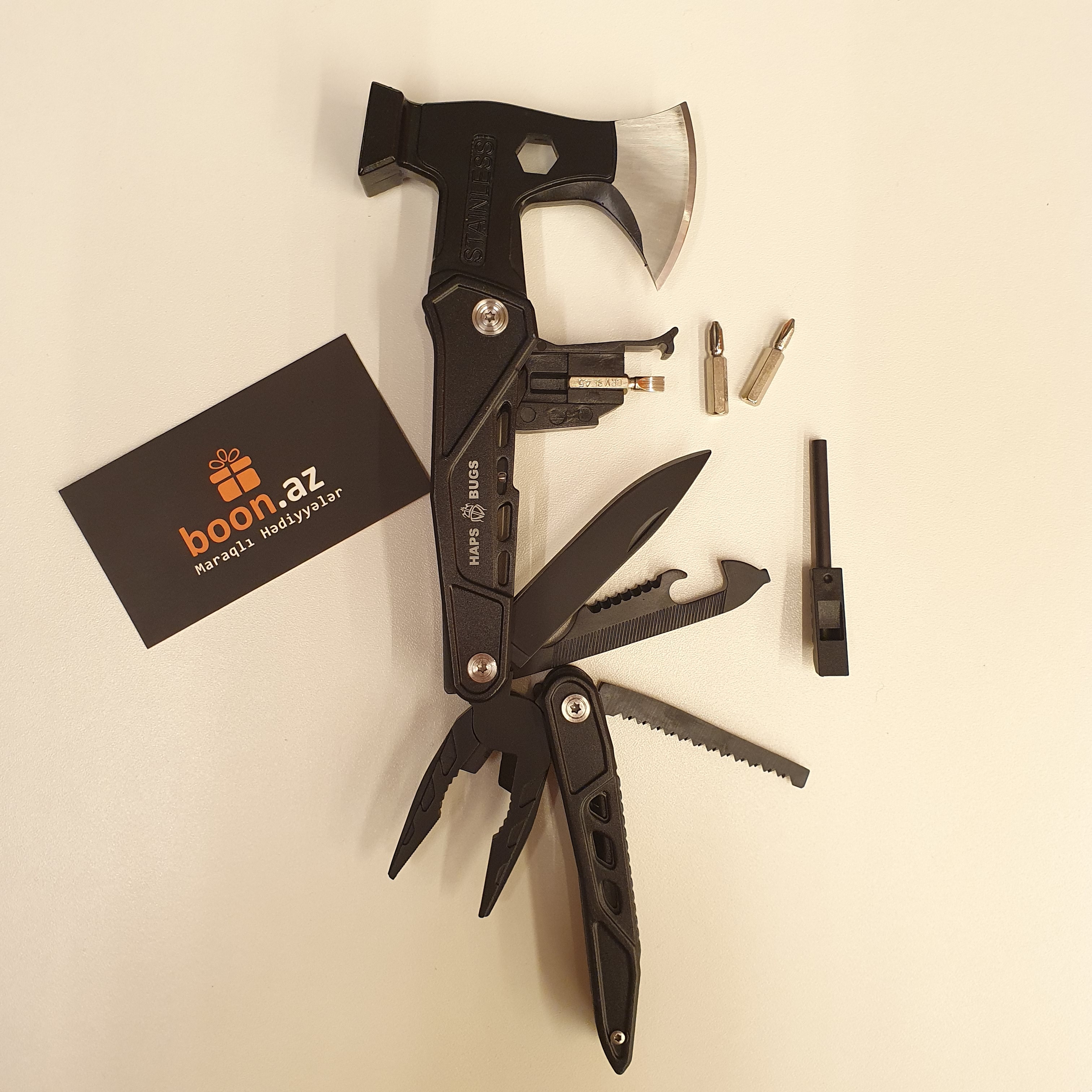 Универсальный мультитул топор-молоток включает в себя плоскогубцы, пилу и острый нож. Напильник и три отвертки - плоская (щелевая), крестовые (3 биты). Маленький консервный нож, открывашку для бутылок. Огниво и свисток. Магнитный битодержатель позволит сохранить ваши биты в целости и не потерять их. Рукоятка топора походного изготовлена из крашенного алюминия, а эргономической форма ручки идеальна для удобного и безопасного удержания в процессе работы. Топор подойдет для туризма и походов. Мультитул туристический станет незаменимым помощником во время охоты и рыбалки. Лучший помощник для работы в саду, на даче и любых бытовых нужд. Мультитул универсальный поможет при срочном ремонте автомобиля. Миниатюрный топорик с плоскогубцами можно легко разместить в рюкзаке с другими аксессуарами, мультитул не займет много места, но выручит в походе не один раз. Мультитул имеет стильный дизайн, практичен. В подарок в комплект входит чехол - сумка для удобства транспортировки, прикрепления к ремню на пояс и безопасности при ношении снаряжения. Так же безопасность носки топорика универсального обеспечивает предохранительный бокс для лезвия. Военный мультиинструмент с легкостью можно разместить в подсумок, бардачок авто или велосипеда или просто положить в ящик с инструментами для машины. Мультитул универсальный топор-молот с плоскогубцами станет отличным подарком для настоящих мужчин на Новый год, 23 февраля и день рождения. Топор для рыбалки, охоты идеально подойдет любителям этих видов развлечений. Так же раскладной топор будет незаменим на кухне во время рубки мяса и костей. Мультитул тактический относится к категории подарки мужчинам, сувениры и экипировка. Можно использовать как ледоруб, стеклобой и стропорез в экстремальных ситуациях. Преподнесите оригинальный подарок папе, мужу и брату. Любимому мужчине, дедушке и сыну. Коллеге, деду и охотнику, пожарному. Упаковано в коробку.