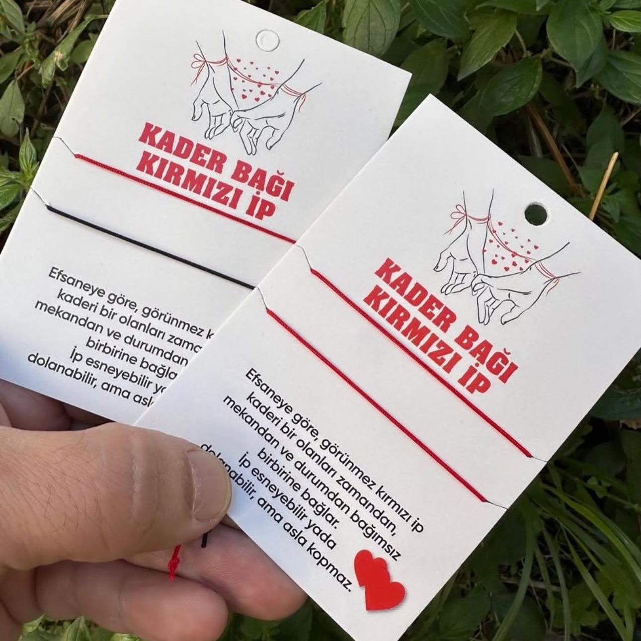 Это декоративный аксессуар под названием "Kader bağı kırmızı ip" (в переводе с турецкого — "Красная нить судьбы"). На упаковке изображены две связанные руки и текст, объясняющий легенду о красной нити. Согласно легенде, невидимая красная нить связывает тех, кому суждено быть вместе, независимо от времени, места и обстоятельств. Нить может растянуться или запутаться, но никогда не порвется. Этот аксессуар часто используется как символ связи, судьбы и любви.