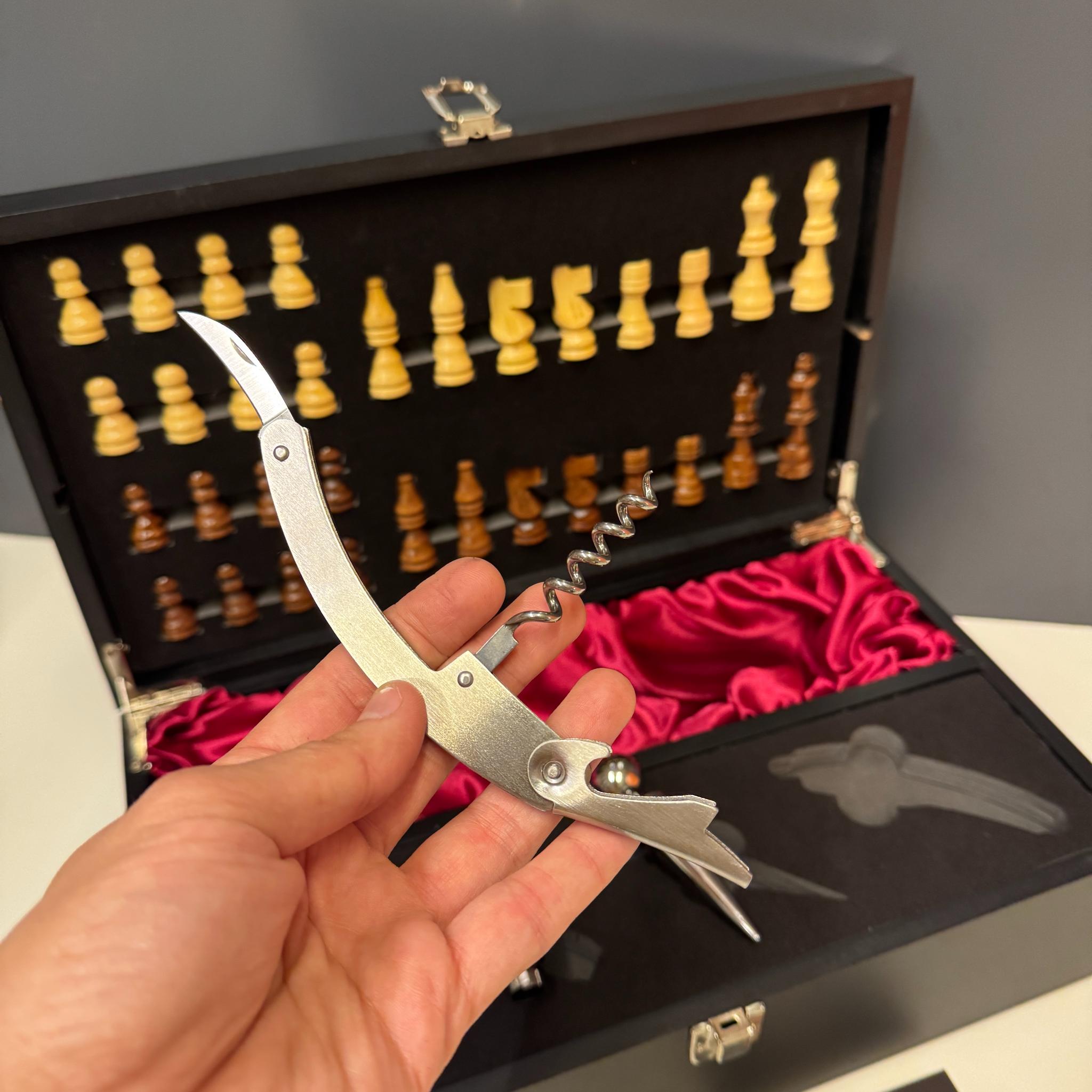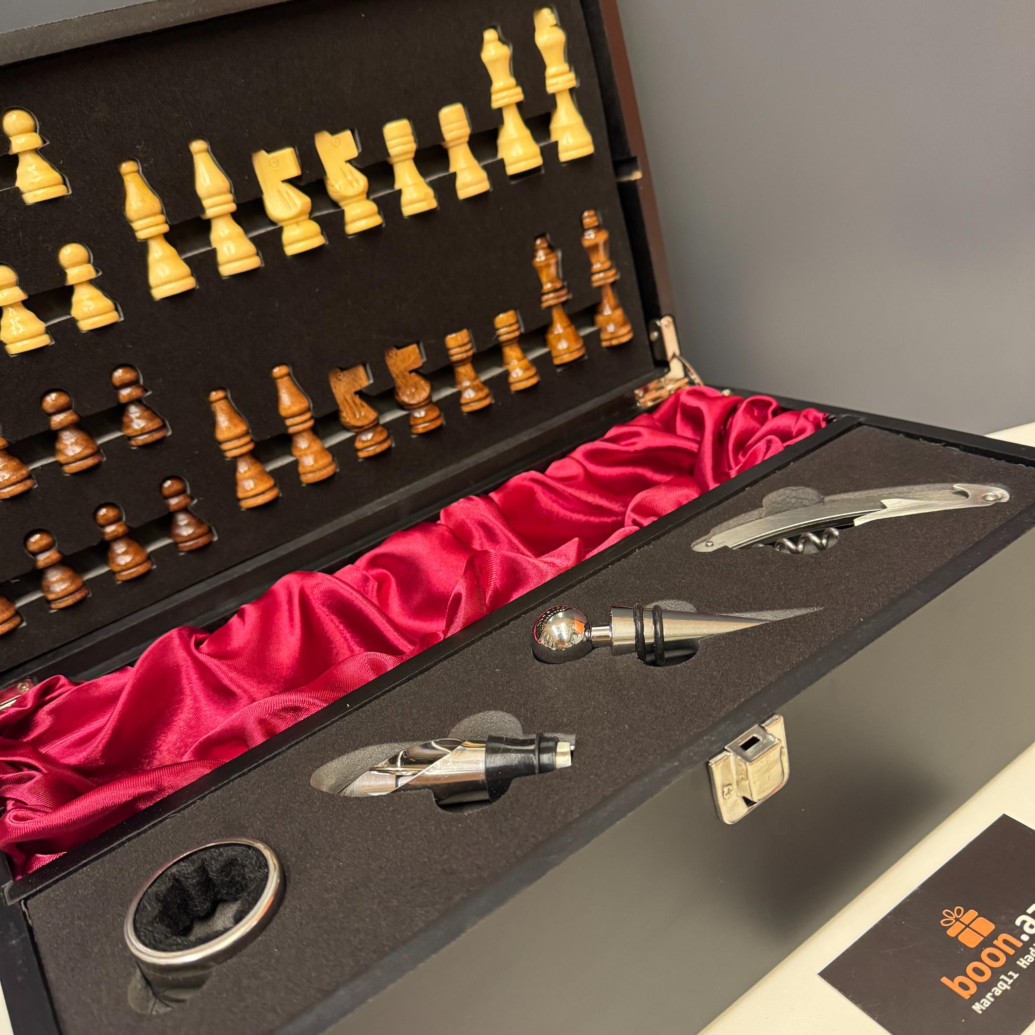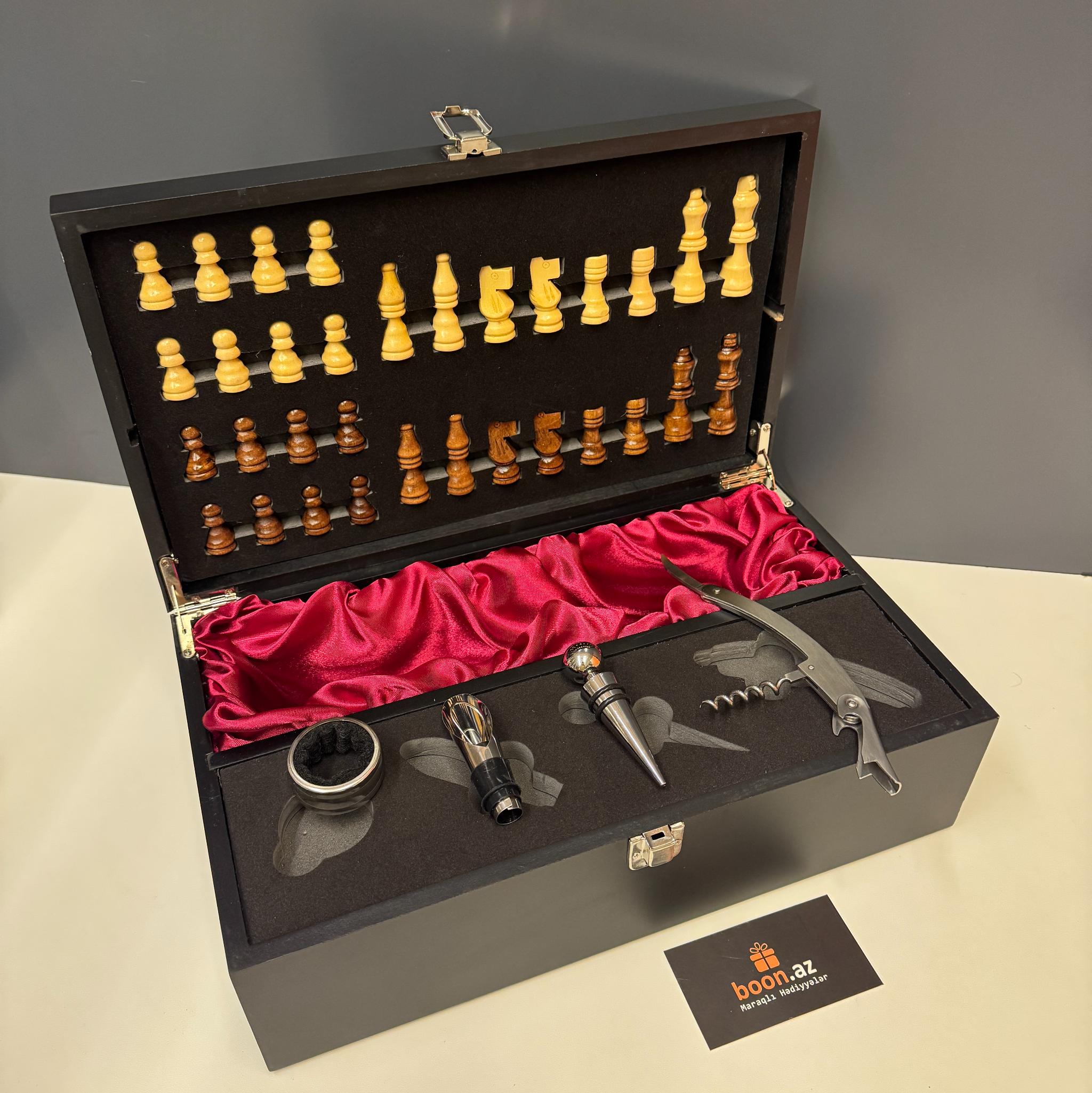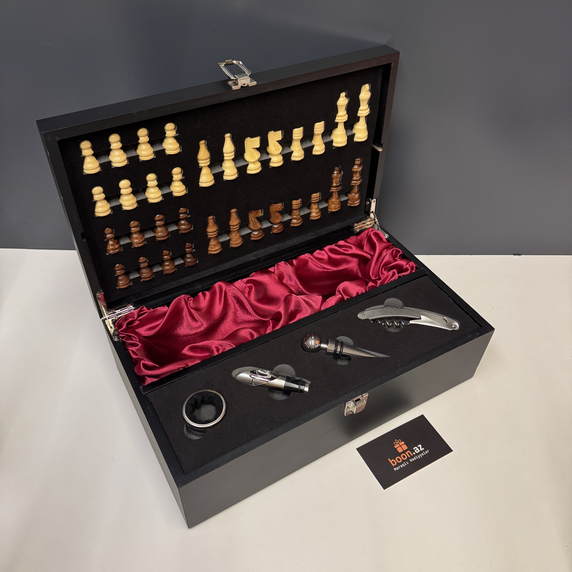 Элегантный и многофункциональный подарочный набор для ценителей вина и интеллектуального досуга. Выполнен в стильной деревянной коробке с бархатной вставкой и эффектной атласной подкладкой.