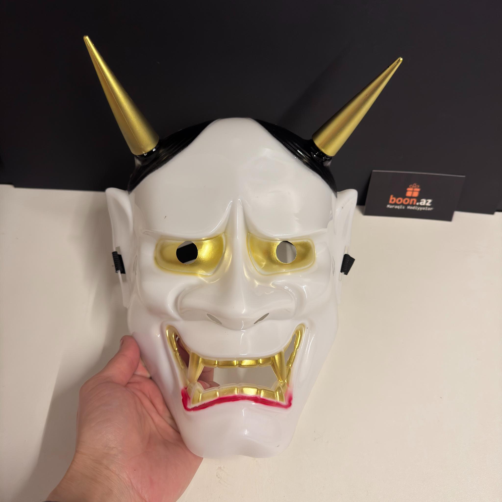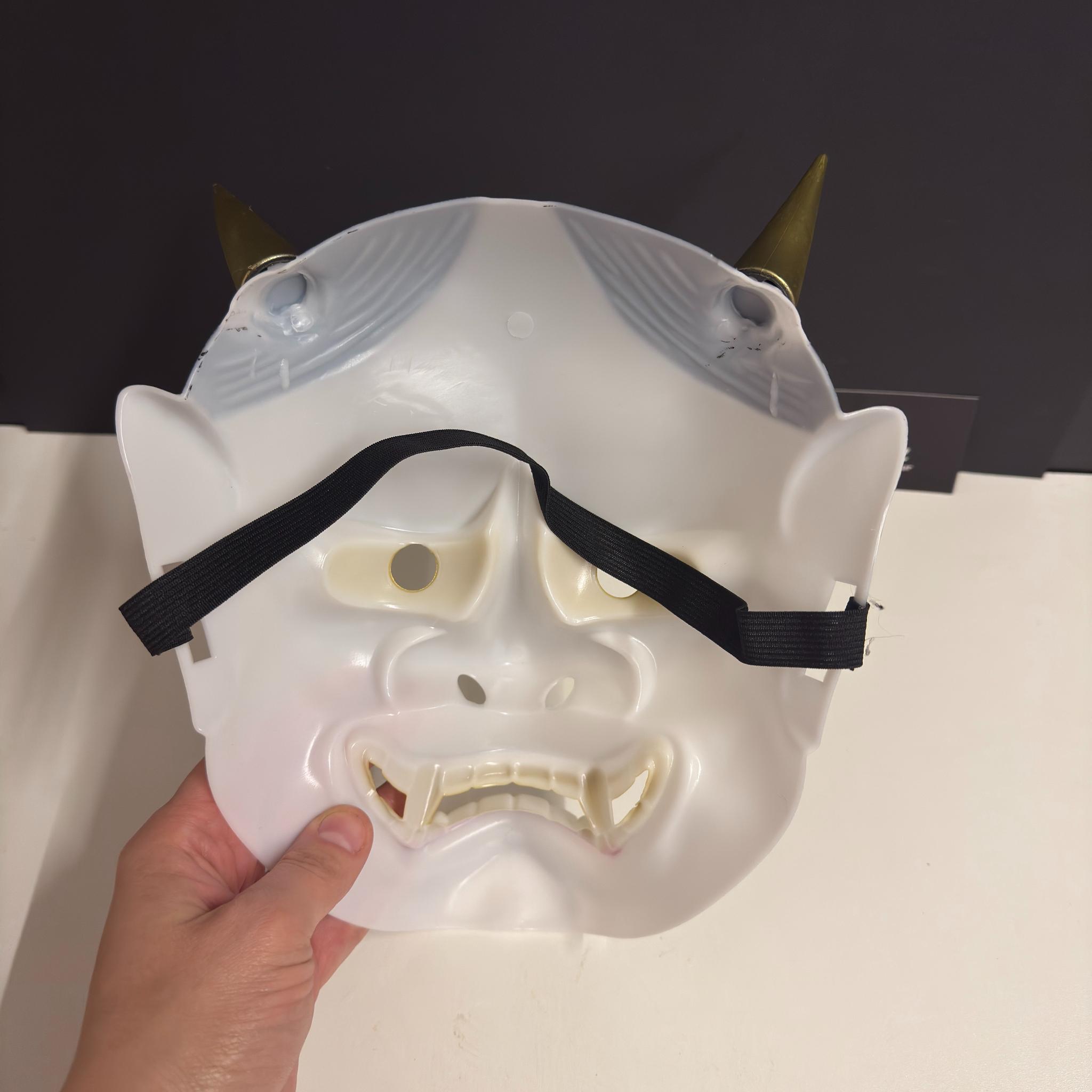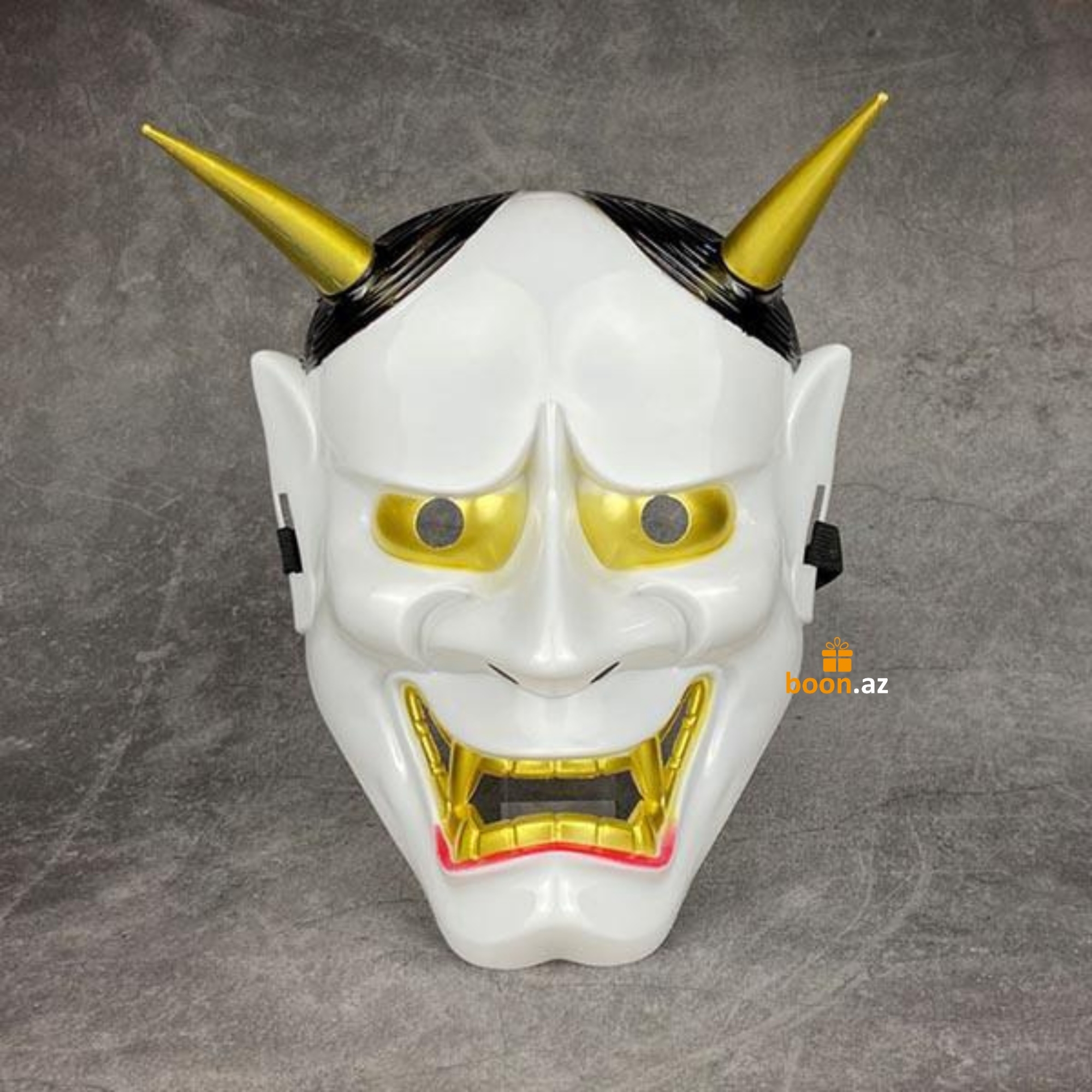 Маска детально передает злобное выражение лица — широко раскрытые глаза и оскаленные зубы создают эффект устрашающего взгляда.