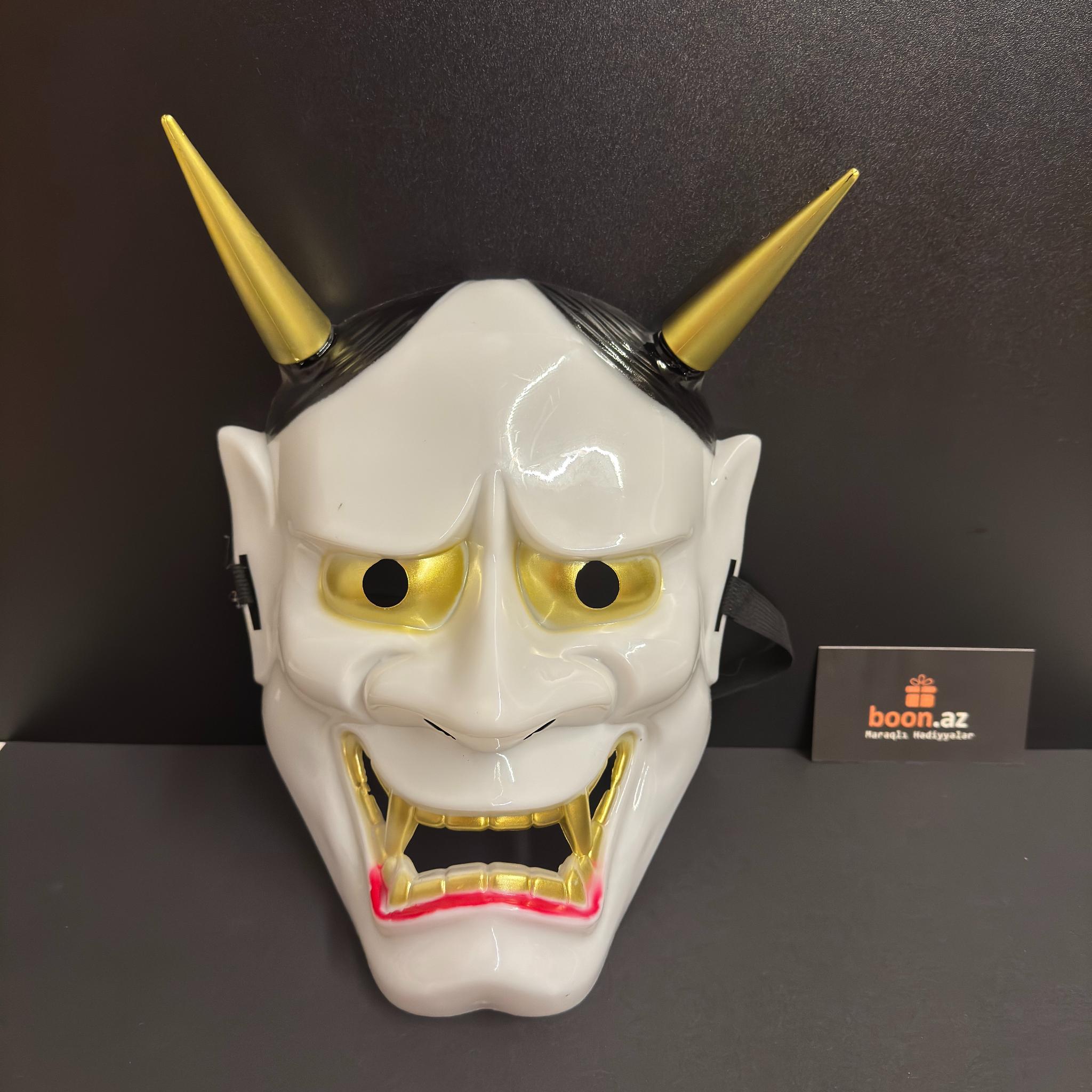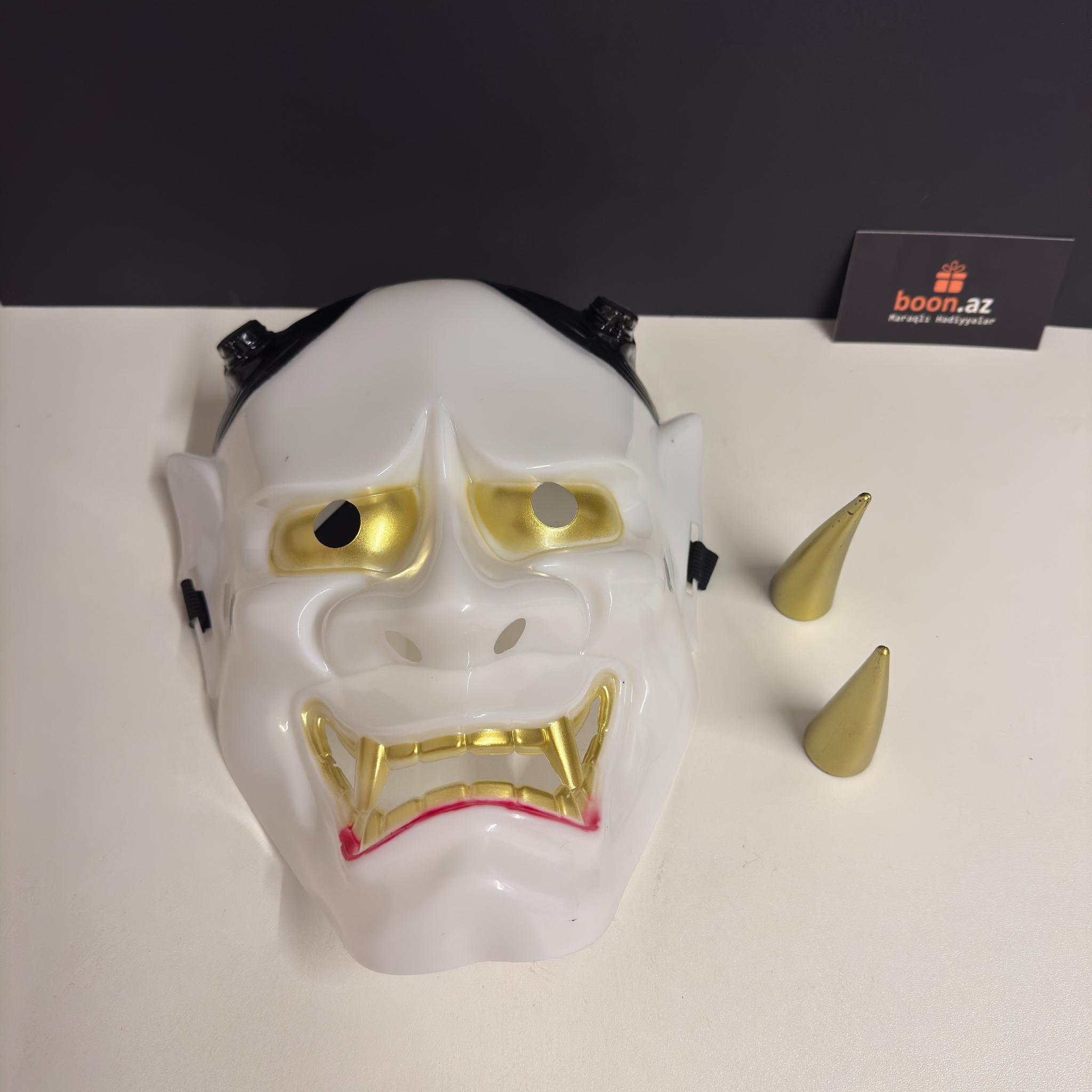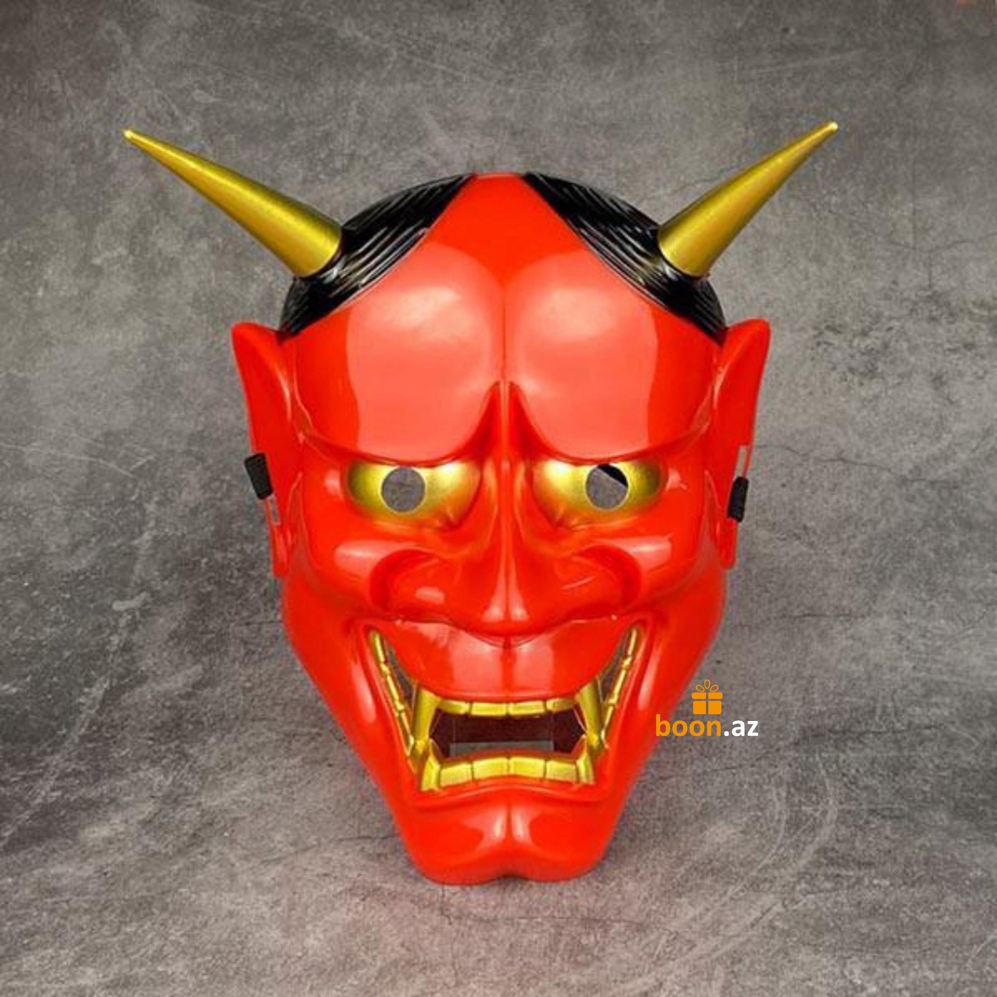 Маска детально передает злобное выражение лица — широко раскрытые глаза и оскаленные зубы создают эффект устрашающего взгляда.