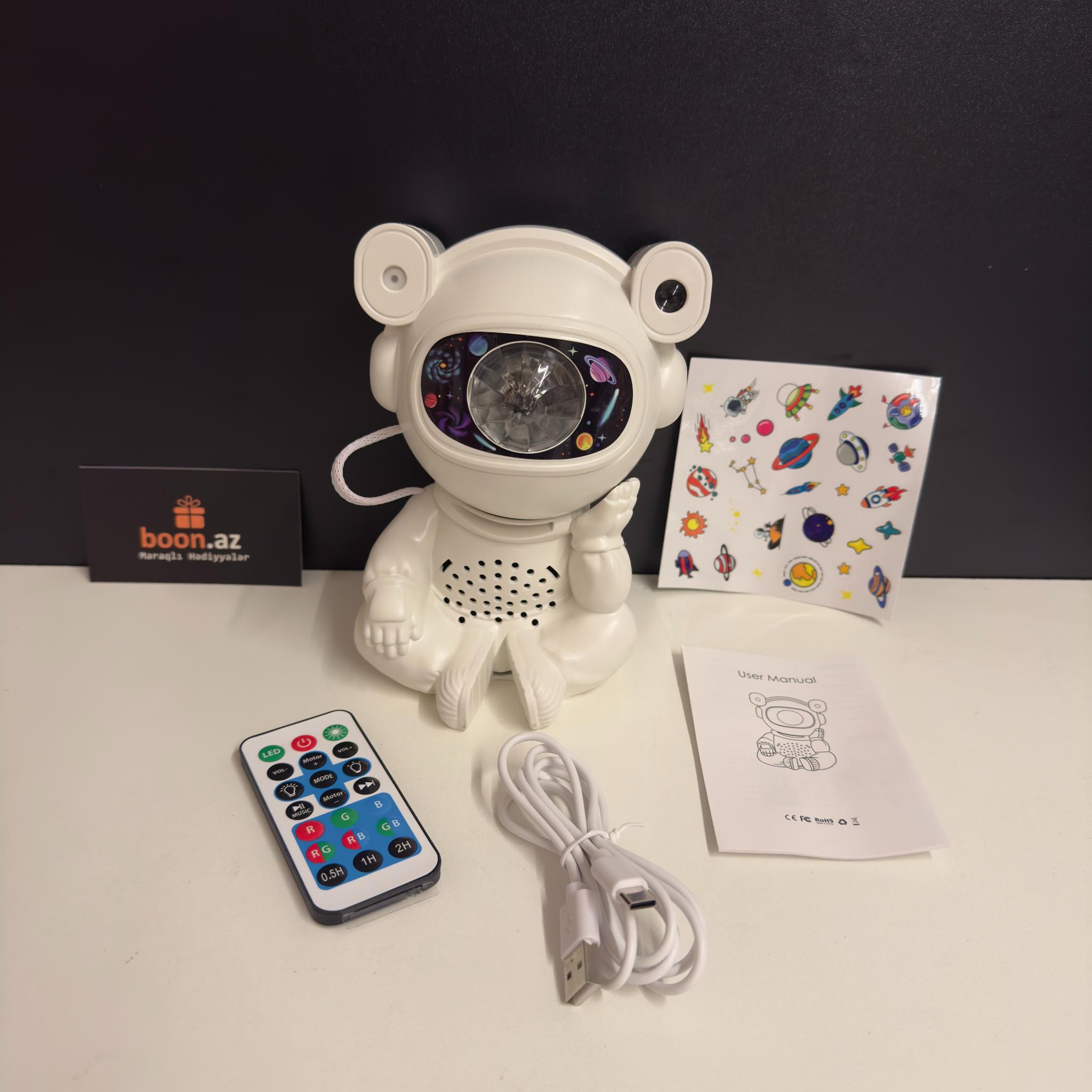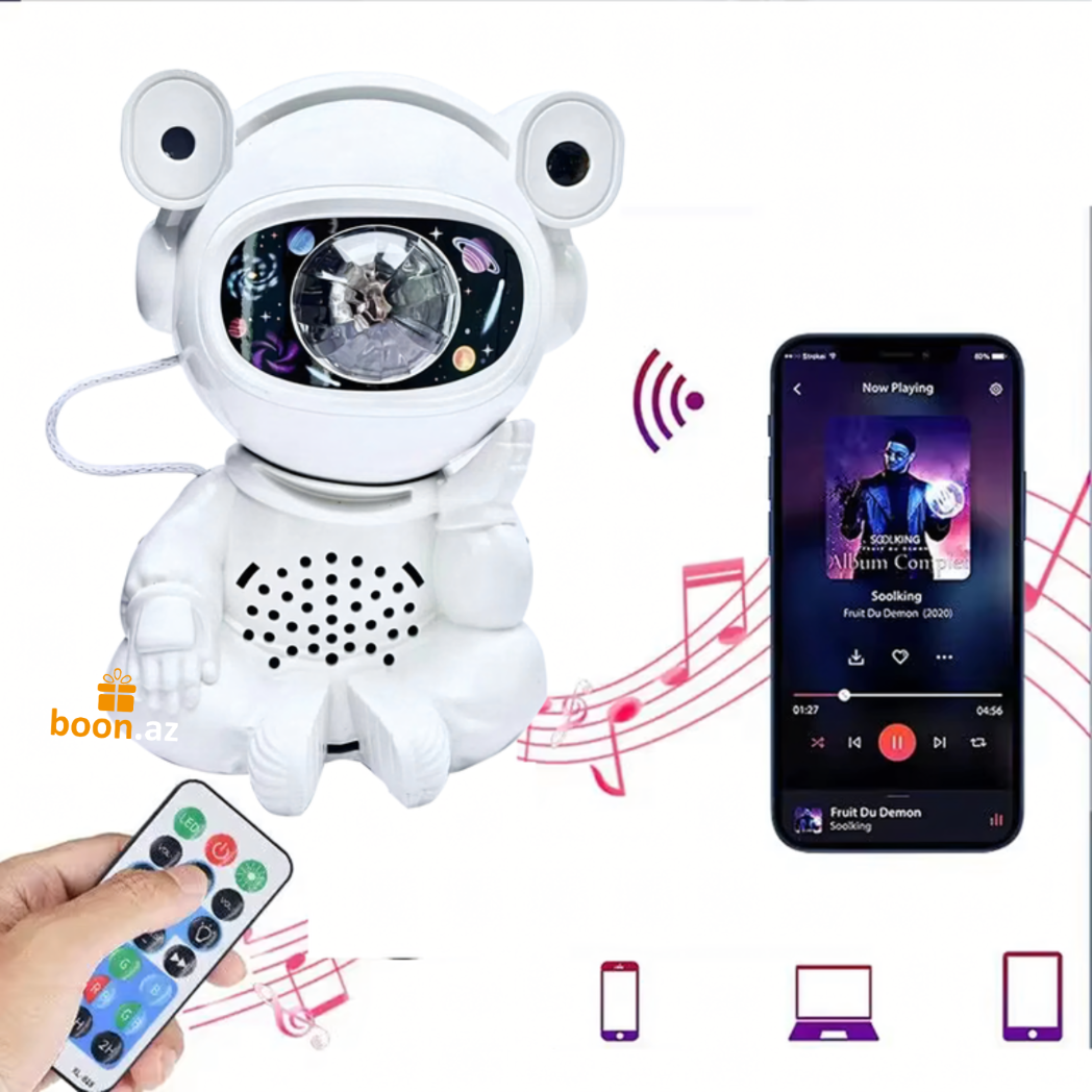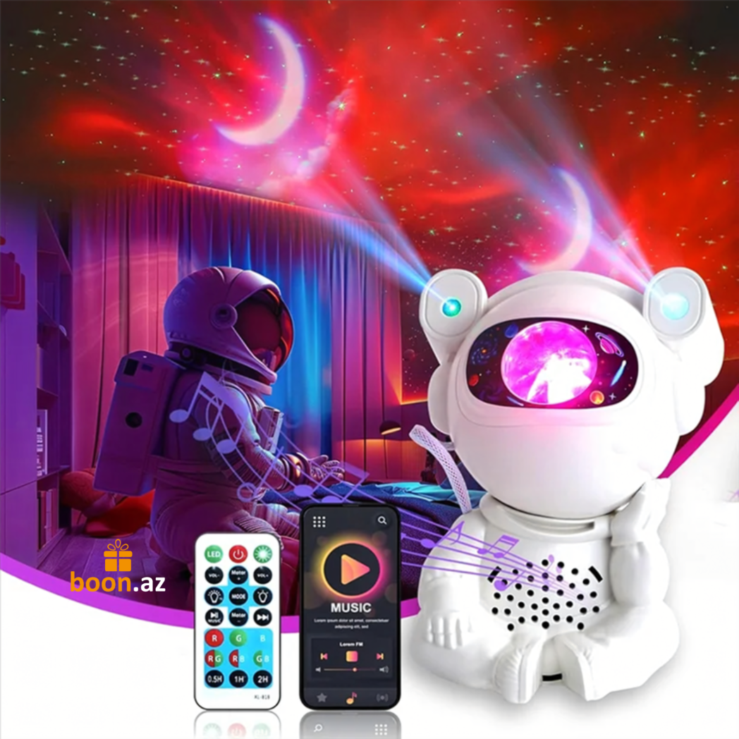 Создайте в комнате атмосферу космического спокойствия с многофункциональным проектором в виде милого астро-медвежонка. Устройство проецирует на потолок яркие неоновые эффекты, звёзды, луну и туманности, наполняя пространство мягким светом и создавая идеальные условия для отдыха, сна или уютных вечеров.