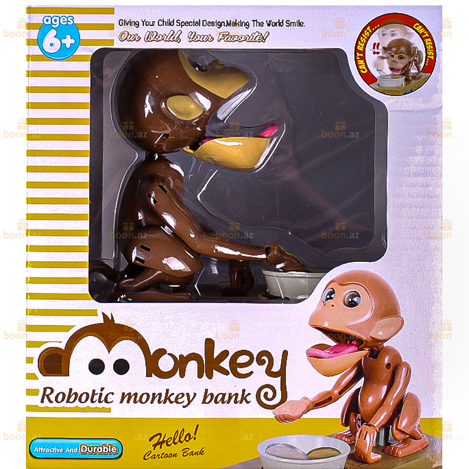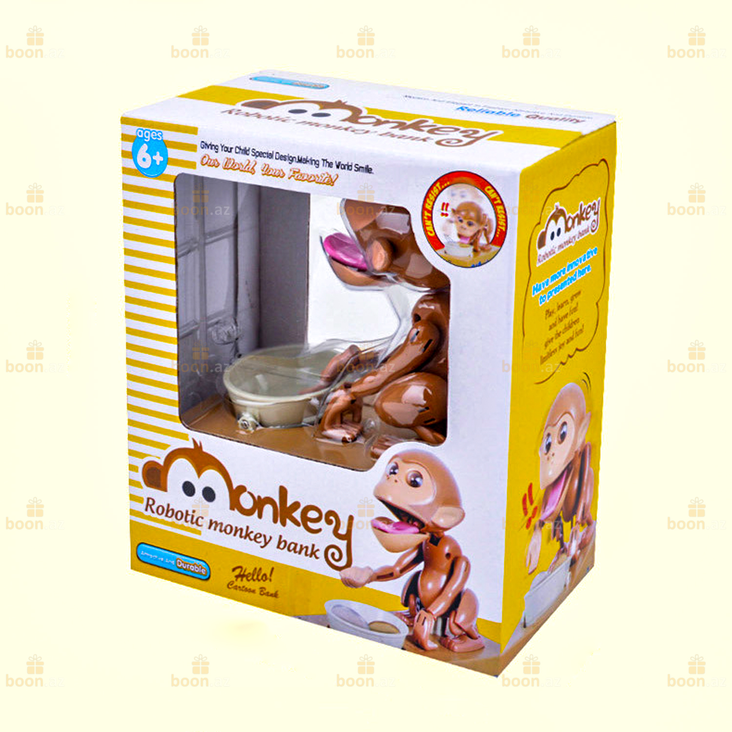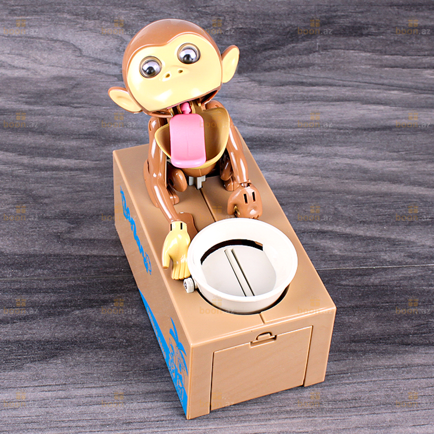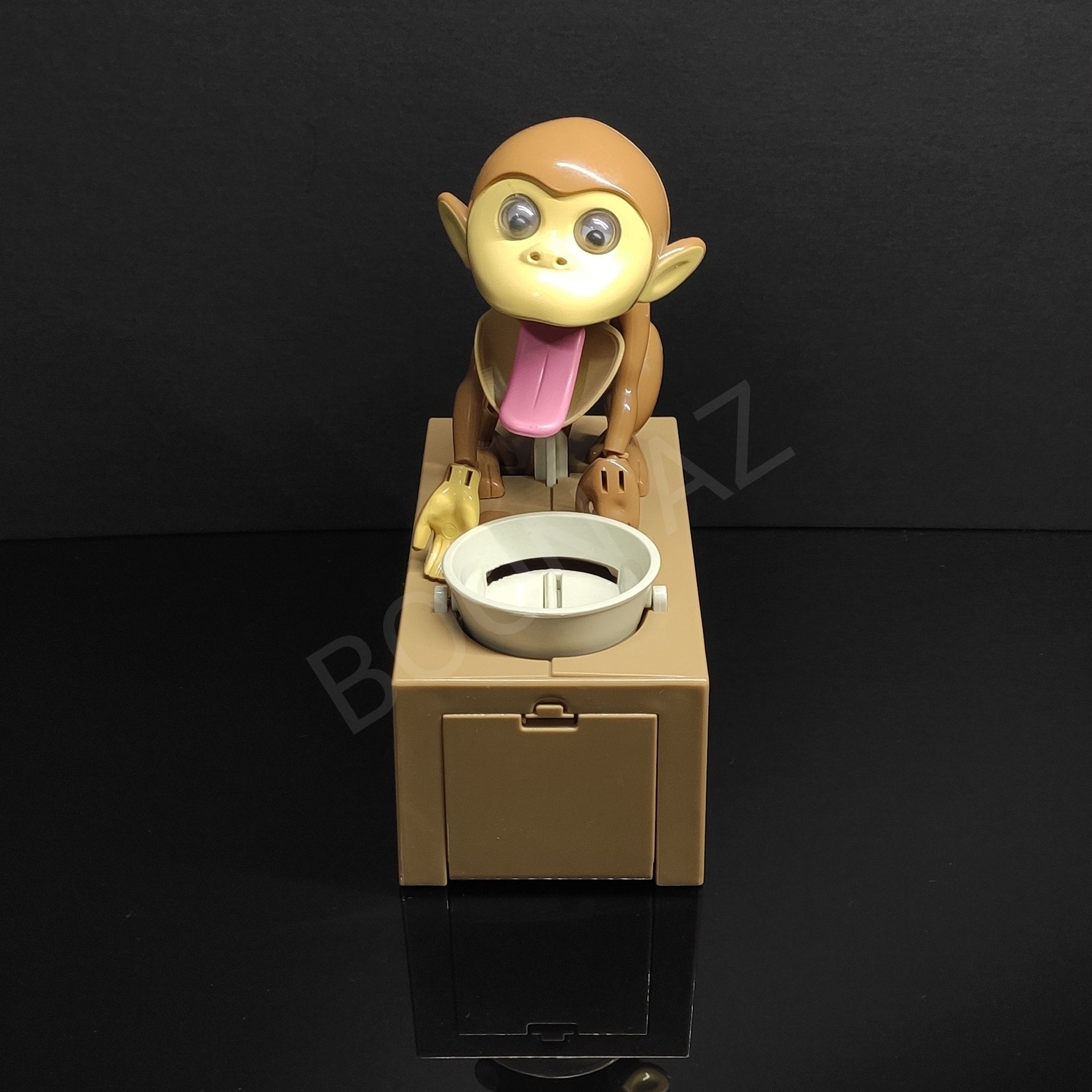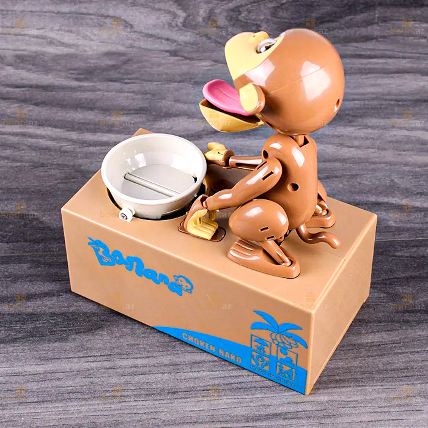 Игрушка выполнена в виде забавной обезьянки, сидящей рядом с миской на коробке .