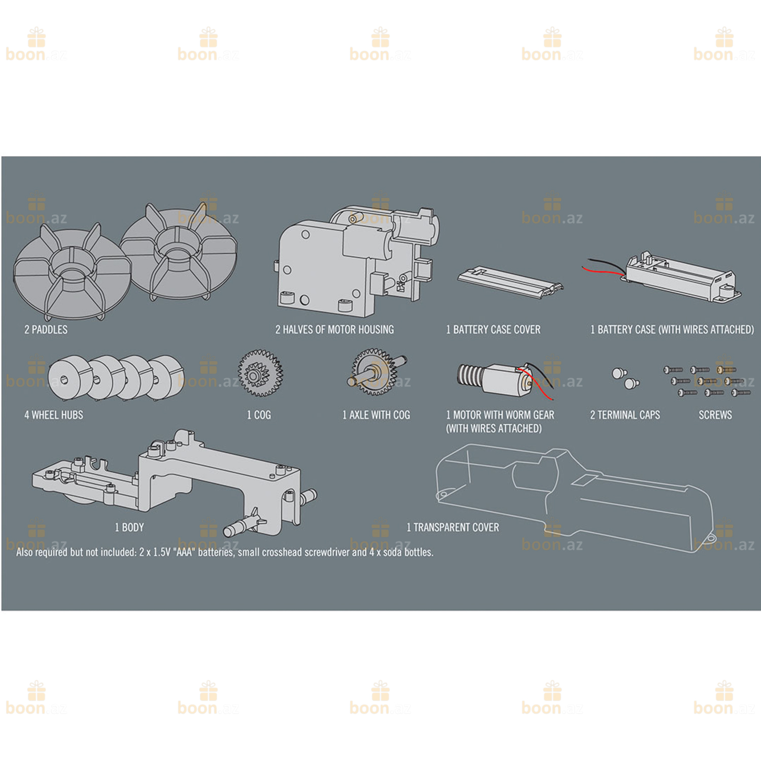 Конструктор Амфибия 4M Конструктор Амфибия — творение команды креативных дизайнеров из Гонконга, позволяющее собрать своими руками настоящую амфибию, которая может ездить по суше как автомобиль, и передвигаться по воде как лодка. В процессе создания и игры с амфибией у ребенка пробуждается интерес к науке, раскрываются его творческие способности и воображение. Особенности: — Набор состоит из составных деталей будущей амфибии — разной формы, величины и материала — Подробная инструкция на русском языке в комплекте — Размеры деталей от 1 до 18 см — Дополнительно потребуется 2 элемента ААА и 4 пластиковые бутылки (в комплект не входят) Игровые возможности: — При помощи подробной инструкции шаг за шагом можно будет собрать амфибию и опробовать ее в работе — Данный набор позволяет играть как одному, так и большой веселой компанией, устраивая веселые состязания — Кроме того, в брошюрке содержатся интересные факты из мира физики, пробуждающие интерес ребенка к этой области науки Совет: — Ребенку может понадобиться помощь взрослых при сборке конструктора В комплекте: 2 гребных колеса, 2 части корпуса мотора, 1 крышка для батарейного отсека, 1 ящик для батареи, 4 ступицы колеса, 1 двойное зубчатое колесо, 1 ось с шестеренкой, 1 мотор с червячным колесом, 2 колпачка зажима, винты, 1 основа корпуса, 1 прозрачная крышка, детальная инструкция