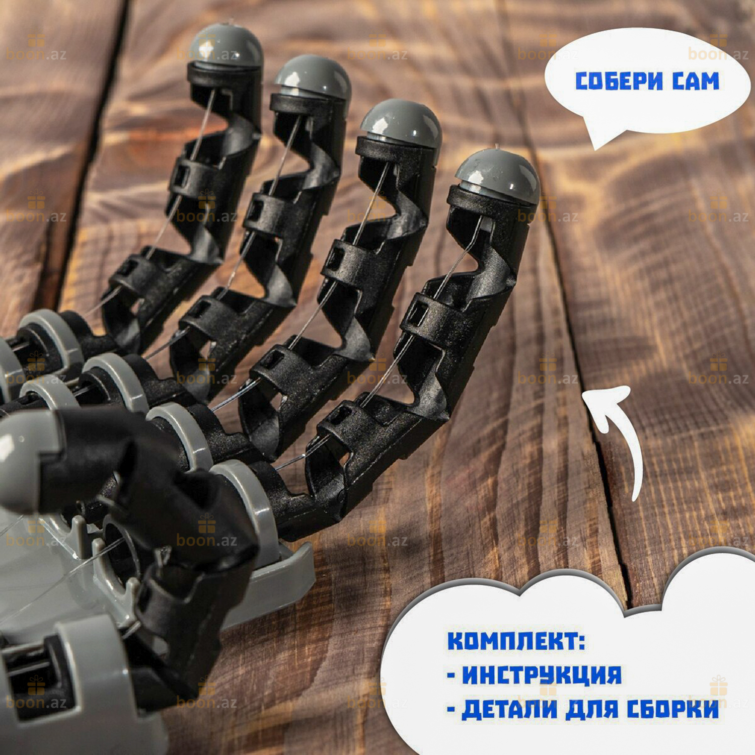 Этот набор содержит все материалы, необходимые для сборки роботизированной руки с полностью сочлененными пальцами.