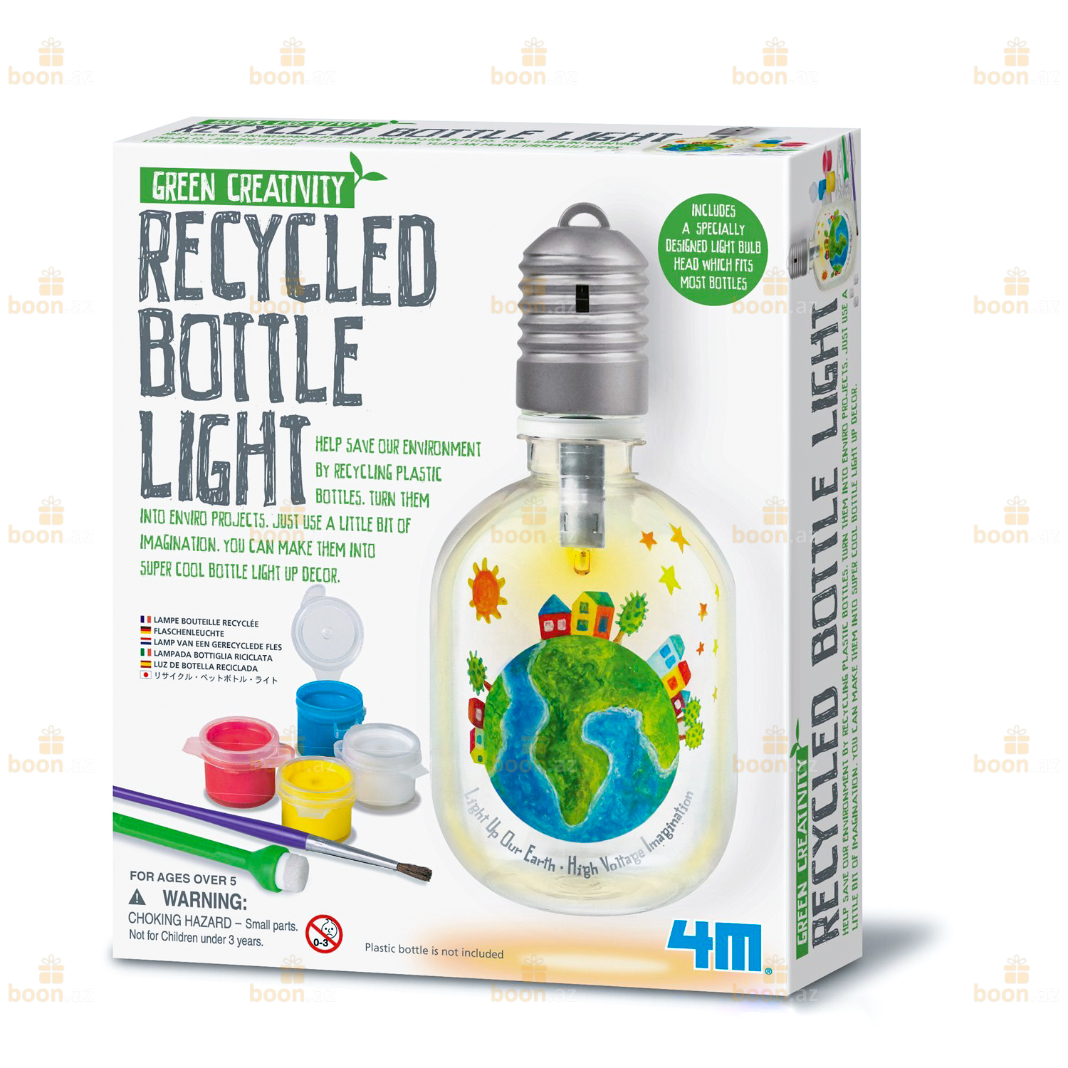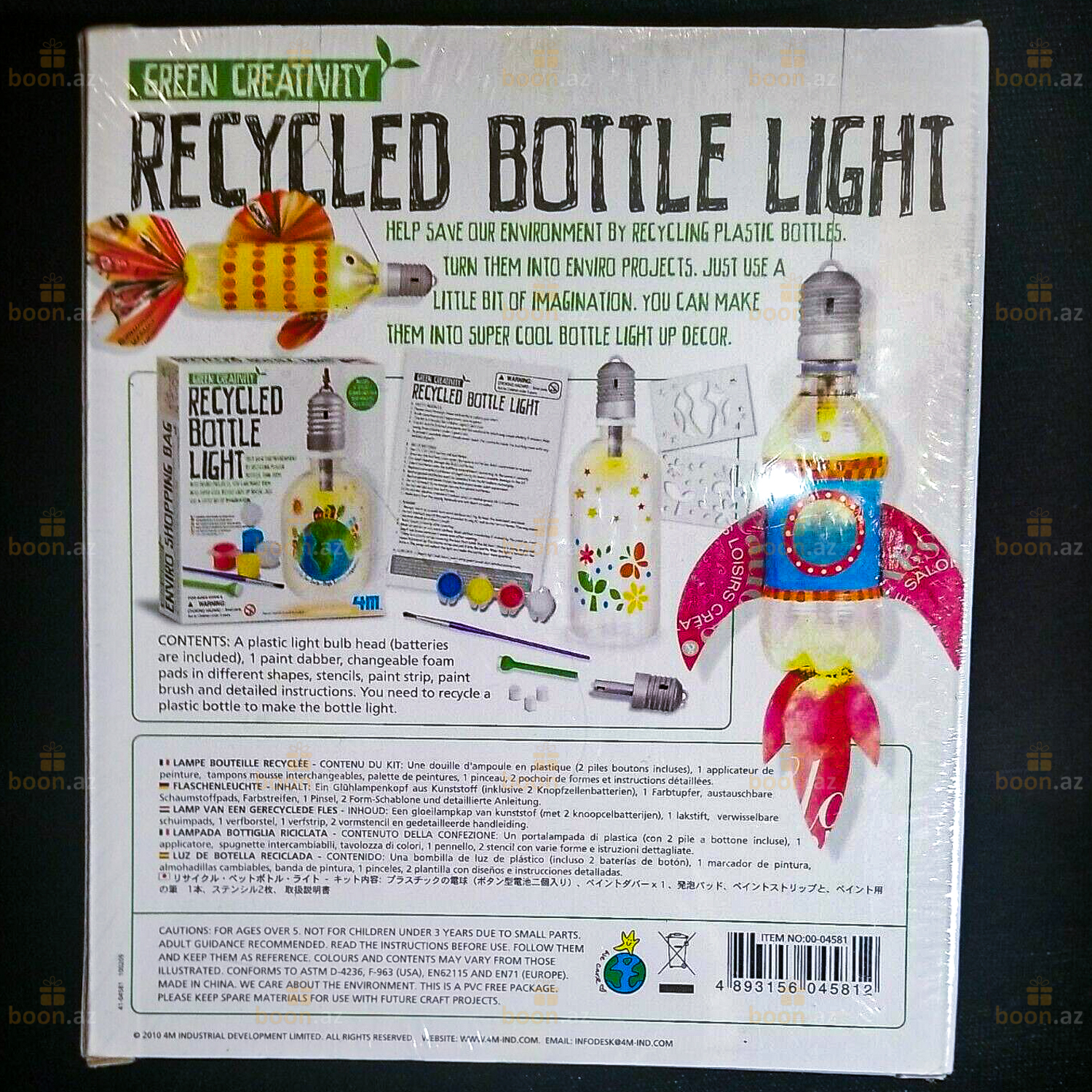 Разработчики 4М стараются сделать детство каждого ребенка неповторимым и удивительным. Их необычные конструкторы, помогают развить воображение, творческие способности и полезные умения, демонстрируя, как из привычных вещей мастерить оригинальные игрушки. На сей раз компания предлагает малышам изготовить чудо-светильник из обычной пластиковой бутылки. В процессе творчества ребенок сможет не только проявить себя, но и узнать о проблеме пластикового загрязнения. Он научится заботиться о природе и перерабатывать ненужные бутылки в фантастические поделки.Чтобы работа принесла лишь позитивные эмоции, в набор вошли все необходимые детали, а также подробная инструкция. С помощью трафаретов и губок нанесите рисунки на бутылку, подождите, когда краска высохнет. Вставьте лампочку, и светильник готов! Украсьте им детскую, гостиную или кухню, привнесите в интерьер уют и тепло ручной работы. Каким будет этот светильник: космической ракетой, золотой рыбкой или волшебным замком? Подскажет фантазия юного художника!Цоколь лампочки подойдет к любой пластиковой бутылке. Поэтому можно смастерить целую коллекцию съемных абажуров и менять их в зависимости от настроения. Пусть творчество будет безграничным! Придумайте собственные элементы декора. Изобразите на светильниках героев любимых мультфильмов, семейные портреты, сюжеты ярких снов или сценки из повседневной жизни. Превратите простые бутылки в яркие арт-объекты!Для создания оригинального светильника начинающему дизайнеру потребуются богатое воображение, умение мыслить нестандартно, аккуратность, терпение и усидчивость. Испытав свои творческие способности и получив удовольствие от работы, ребенок обязательно захочет освоить новое хобби. И в этом ему, как всегда, помогут наборы от 4М.Что входит в комплект: Пластиковая лампочка с 2 батарейками LR44 (таблетки); Трафареты; Устройство для нанесения краски; 4 сменные губки разной формы; 4 баночки с красками разных цветов; Кисточка; Инструкция . Лампочка работает от 2 батареек LR44, которые входят в набор. Набор содержит мелкие детали. Не предназначен для детей младше 3 лет. Работа проводится только под надзором взрослых.