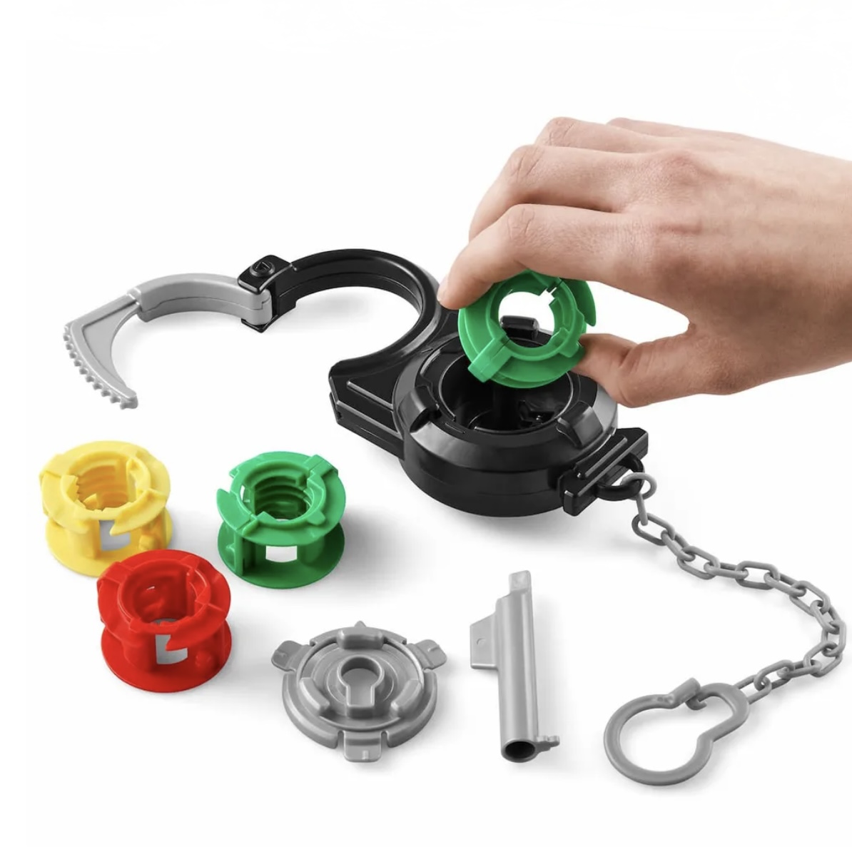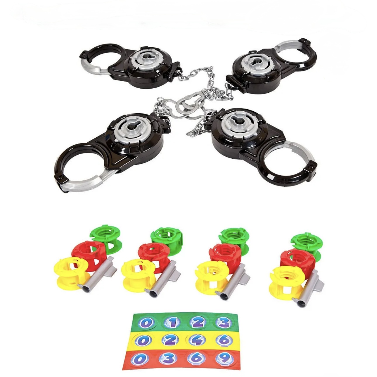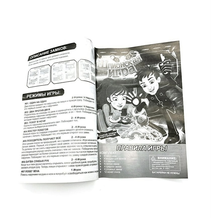 В комплекте: 4 пары наручников с отмычками, 12 замков лабиринтов разной сложности, 12 монет очков, инструкция на русском языке.