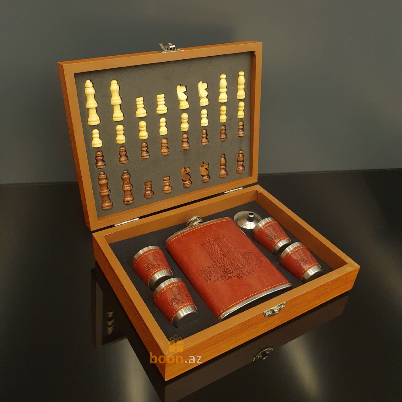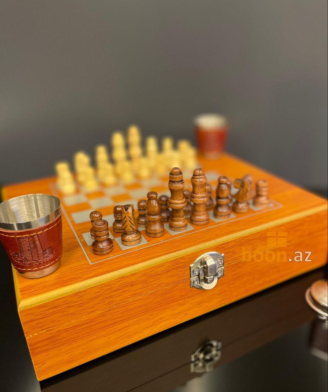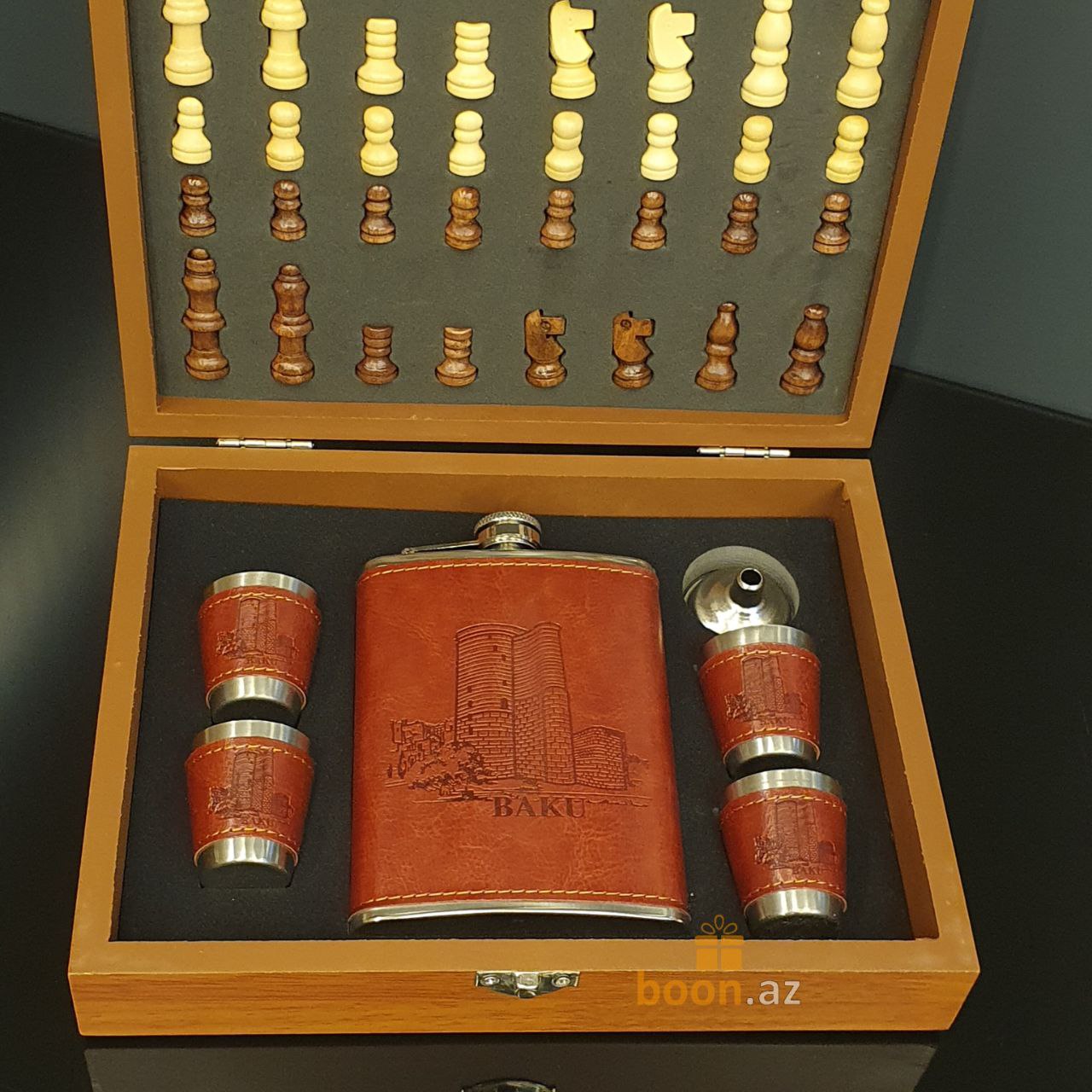 Почувствуйте вкус хорошей жизни с подарочным набором шахмат, фляги и металлических стаканчиков. Фляга и стаканчики выполнены в едином классическом стиле, обтянуты коричневой искусственной кожей и уложены в деревянную подарочную коробку, которая также является шахматной доской. Отличный подарок для руководителя, папе, любимому человеку, другу, для любого, кто любит прекрасные и качественные вещи в жизни. Замечательный джентельменский набор на любой случай жизни! Эта фляга и набор из 4 стопок изготовлен из прочной нержавеющей пищевой стали, которые обернуты красивой коричневой кожей PU.
