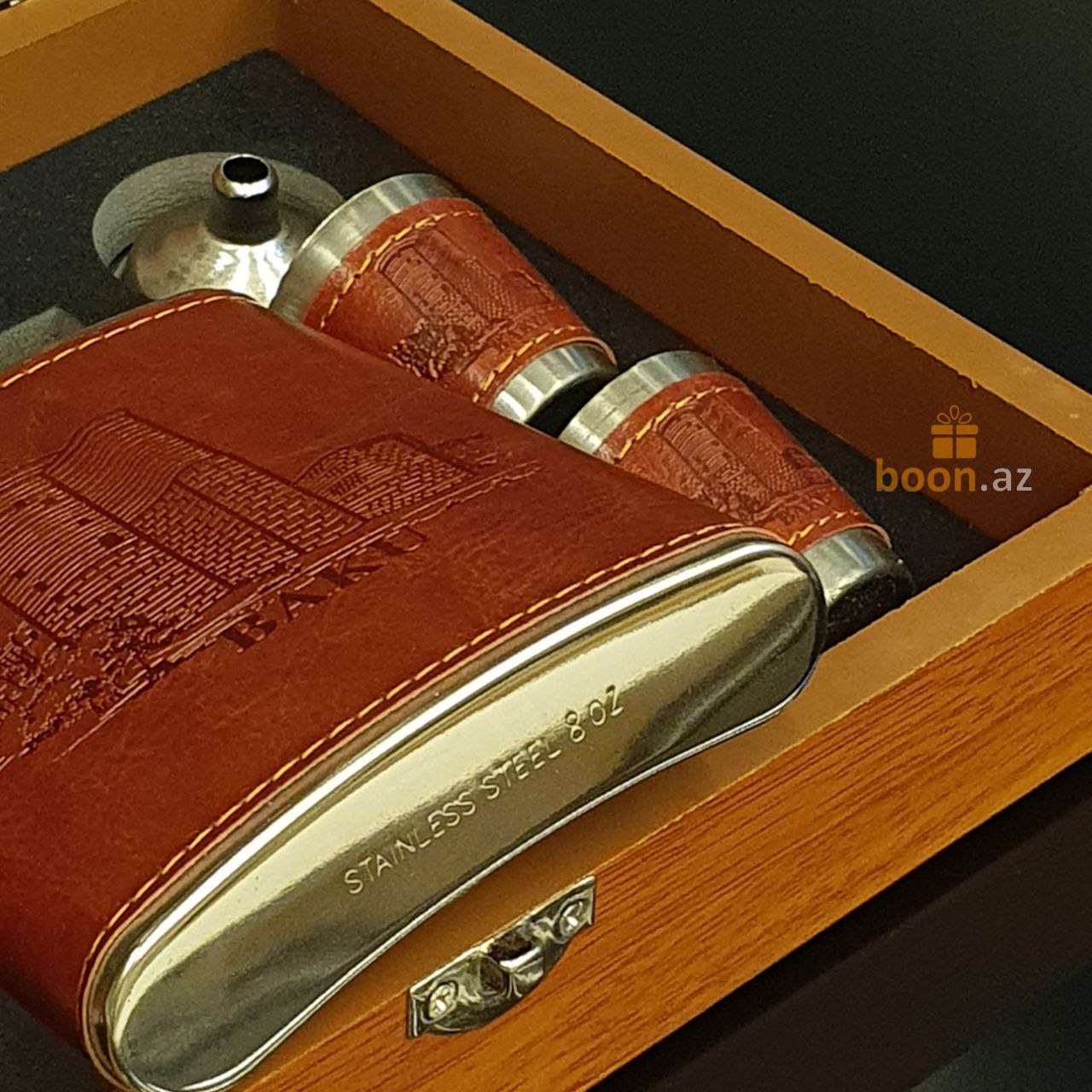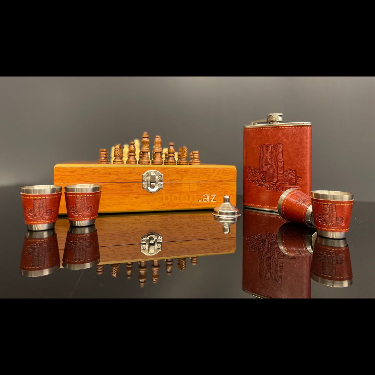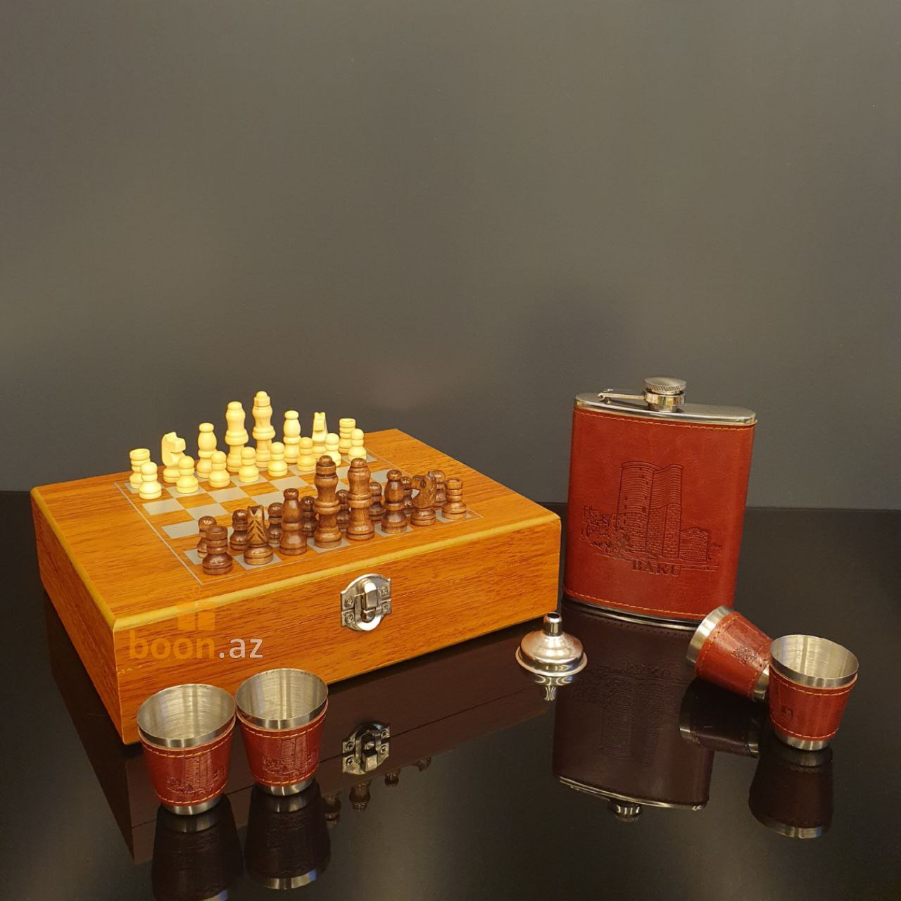 Почувствуйте вкус хорошей жизни с подарочным набором шахмат, фляги и металлических стаканчиков. Фляга и стаканчики выполнены в едином классическом стиле, обтянуты коричневой искусственной кожей и уложены в деревянную подарочную коробку, которая также является шахматной доской. Отличный подарок для руководителя, папе, любимому человеку, другу, для любого, кто любит прекрасные и качественные вещи в жизни. Замечательный джентельменский набор на любой случай жизни! Эта фляга и набор из 4 стопок изготовлен из прочной нержавеющей пищевой стали, которые обернуты красивой коричневой кожей PU.