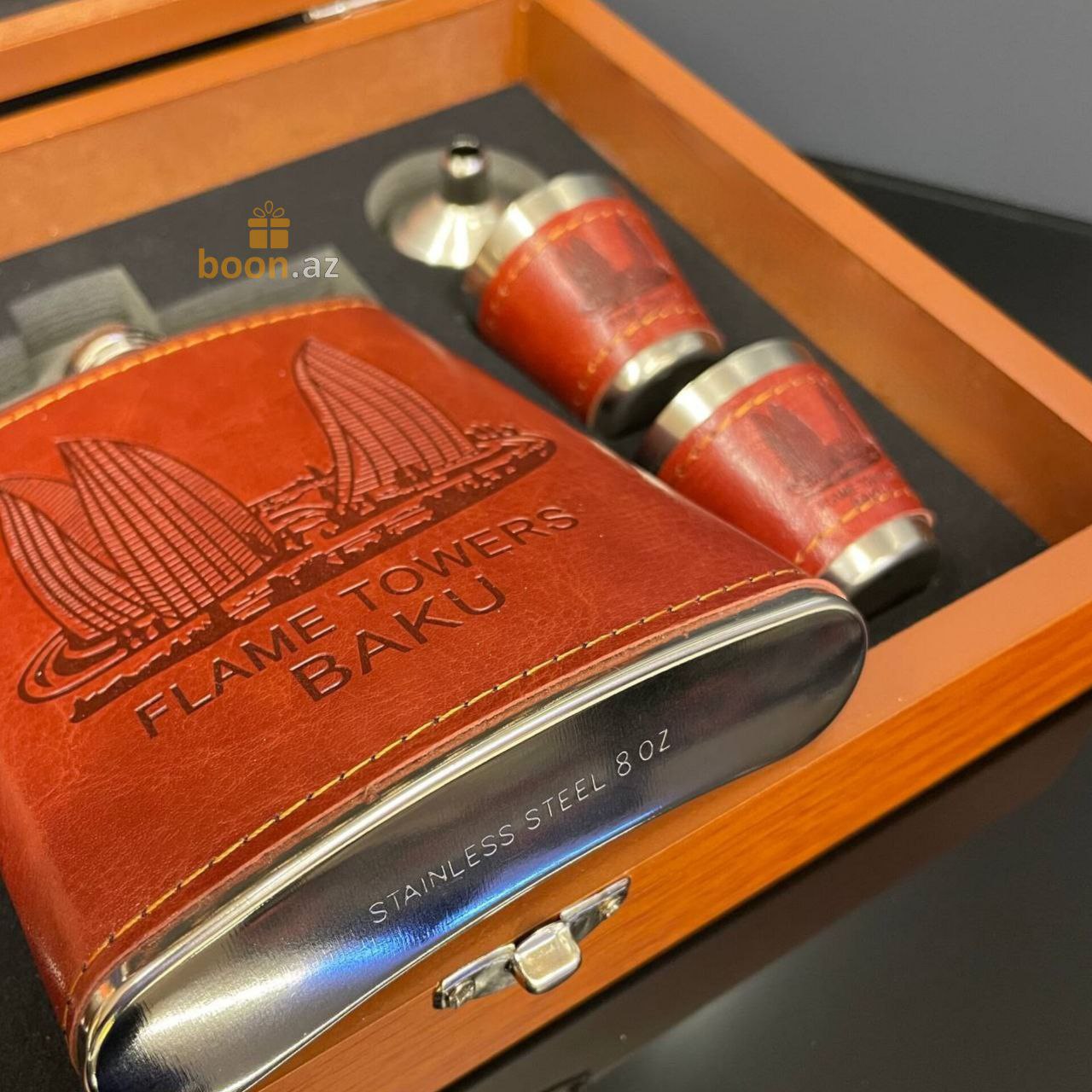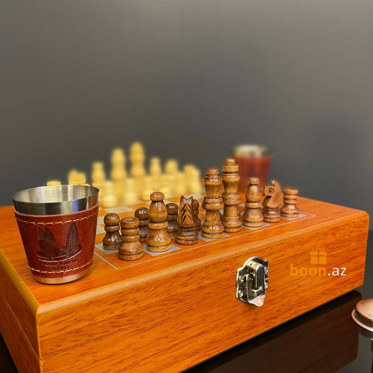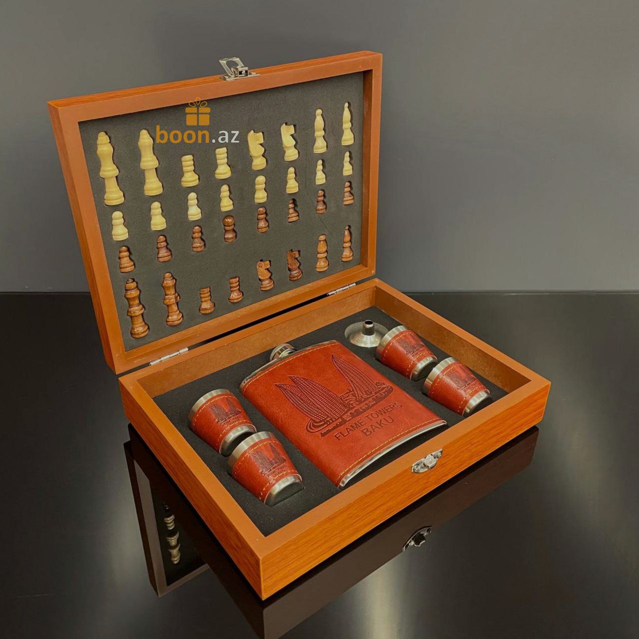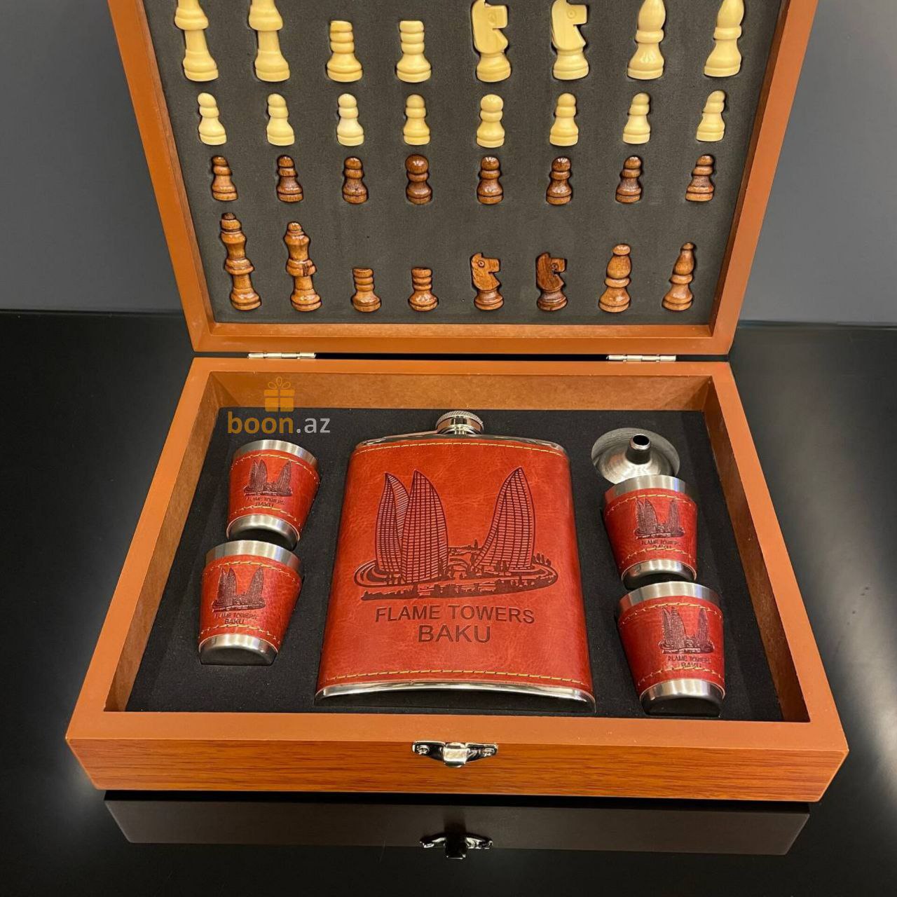 Почувствуйте вкус хорошей жизни с подарочным набором шахмат, фляги и металлических стаканчиков. Фляга и стаканчики выполнены в едином классическом стиле, обтянуты коричневой искусственной кожей и уложены в деревянную подарочную коробку, которая также является шахматной доской. Отличный подарок для руководителя, папе, любимому человеку, другу, для любого, кто любит прекрасные и качественные вещи в жизни. Замечательный джентельменский набор на любой случай жизни! Эта фляга и набор из 4 стопок изготовлен из прочной нержавеющей пищевой стали, которые обернуты красивой коричневой кожей PU.