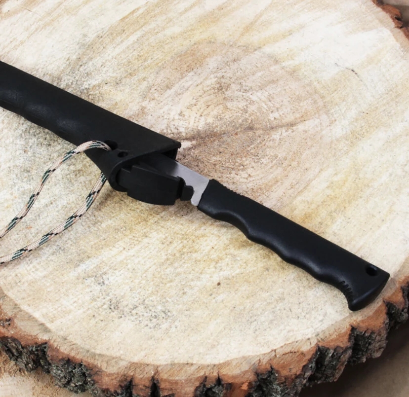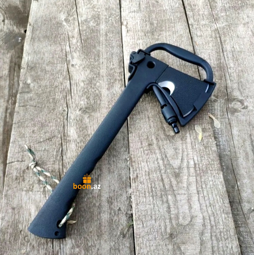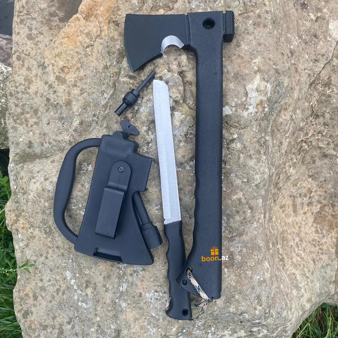 Мультитул включает в себе: топор, нож (30х3,5см), стропорез, огниво, свисток, молоток, резак, чехол с рукояткой.