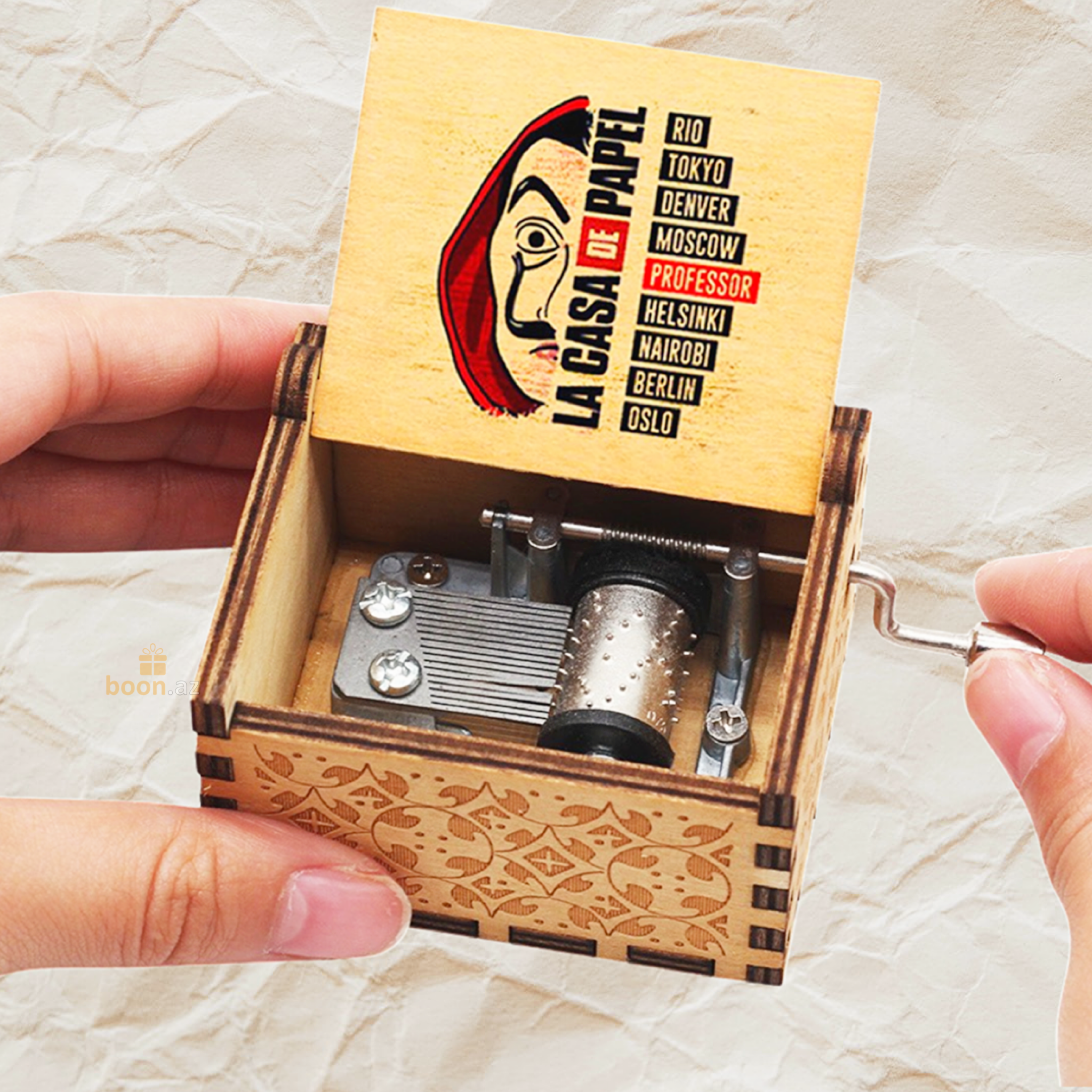 Деревянная музыкальная шкатулка "Бумажный дом" La casa de papel - оригинальный подарок на любой праздник! Ручная работа и натуральные материалы. Резная и компактная шкатулка станет отличным подарком для всех фанатов сериала "Бумажный дом". Воспроизводит одну из главных музыкальных тем сериала - "Bela Ciao". Музыкальная шкатулка изготовлена из древесины хвойных пород дерева высшего качества. Высокое качество гравировки шкатулки шарманки четко передает картинку  и позволяет окунуться в волшебный мир, услышав легендарные мелодии снова! Такая шарманка станет идеальным украшением интерьера. Стильная музыкальная шкатулка из дерева с тематическими принтами станет украшением любой комнаты в вашем доме. Музыка звучит после приведения рукояти шкатулки в движение. Скорость звучания мелодии зависит от скорости движения ручки маленькой шкатулки. Музыкальная шкатулка - идеальный подарок, если Вы хотите подарить восторг, прекрасное настроение и незабываемые эмоции! Удивляйте, радуйте близких и любимых оригинальным подарком! Миниатюрный музыкальный бокс подойдет в качестве сувенира для ваших близких и друзей на новый год, день рождения, 8 марта, 23 февраля и просто, чтобы порадовать близкого человека.