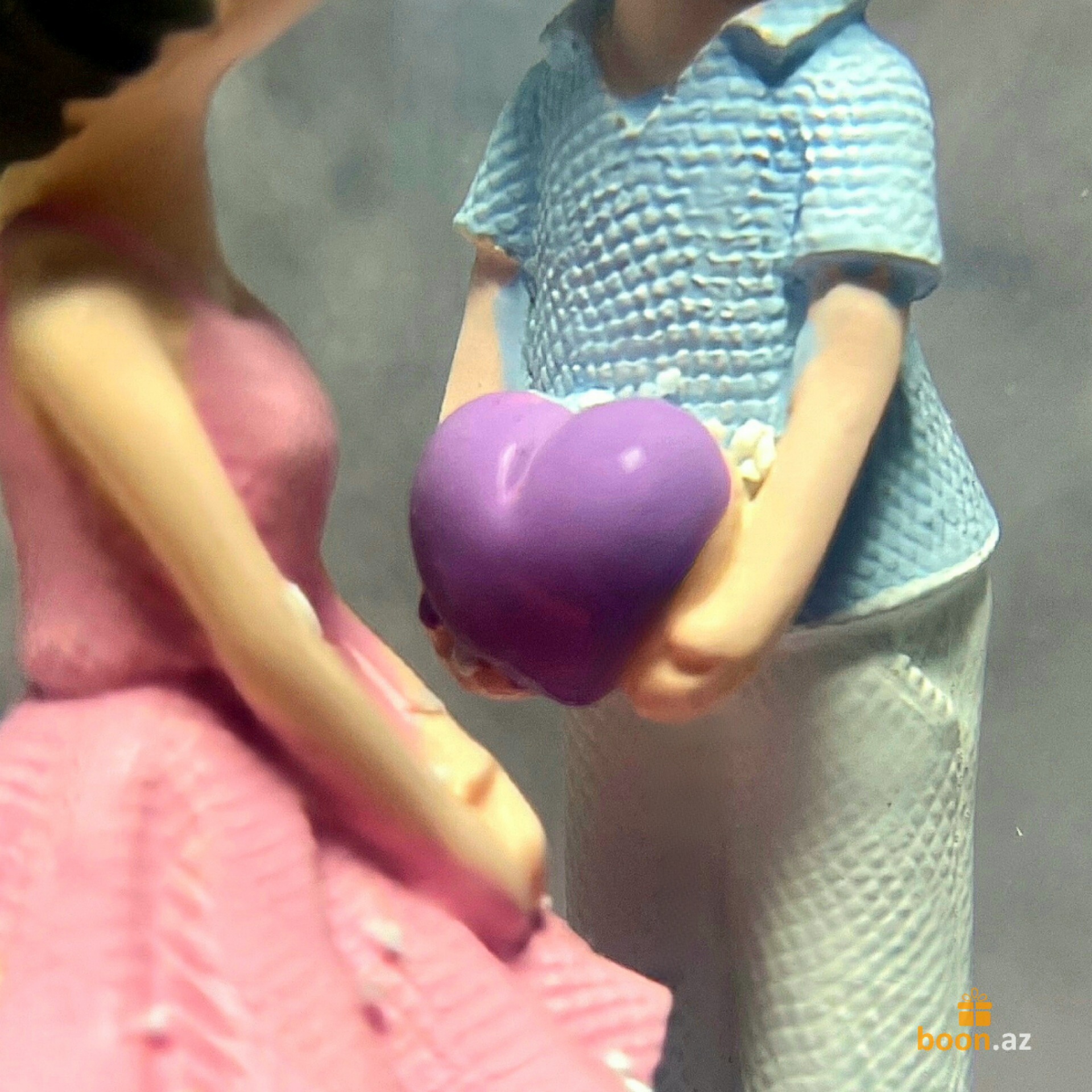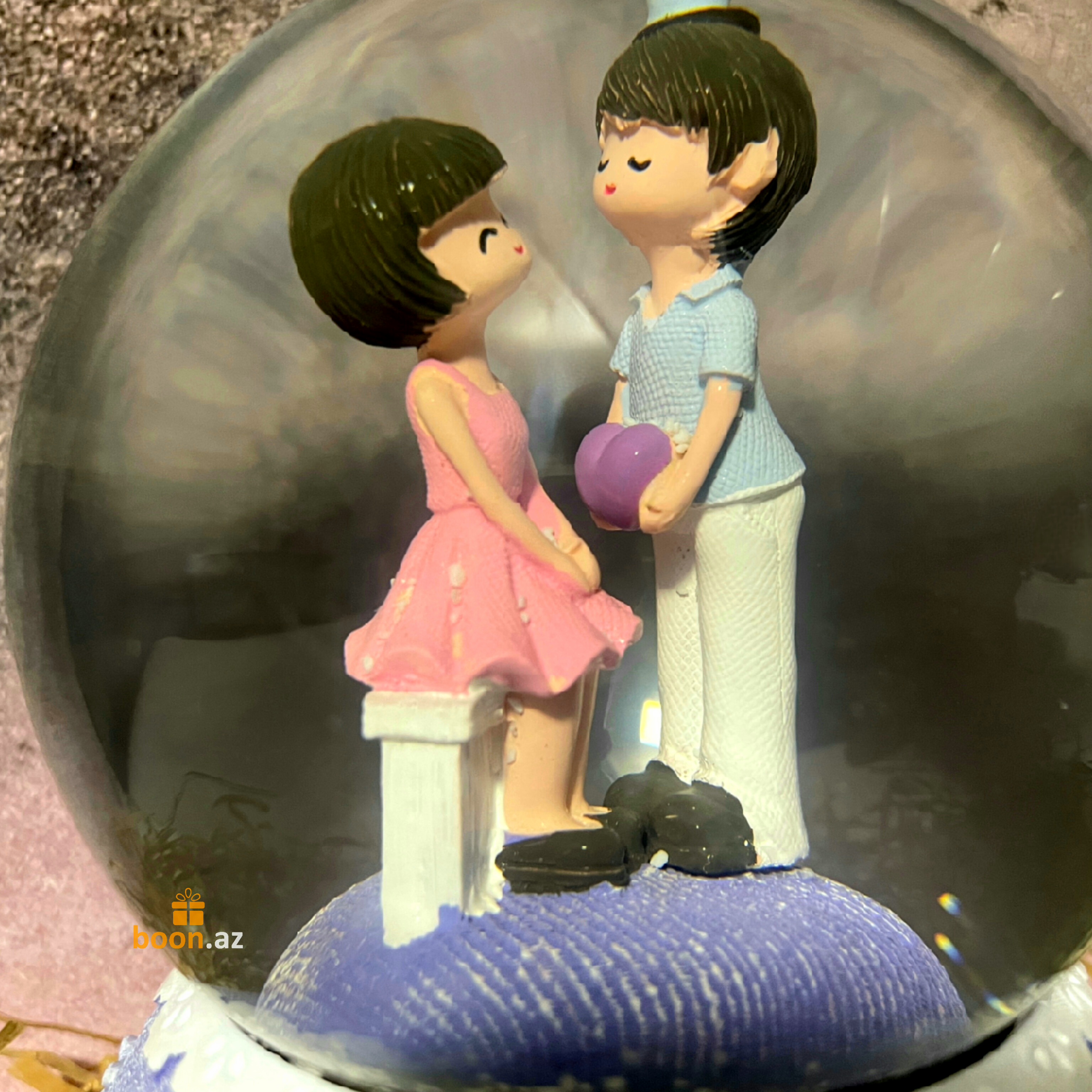 Сувенир представляет из себя стеклянную колбу с сюжетом внутри: мальчик дарит девочке подарок в виде сердца.