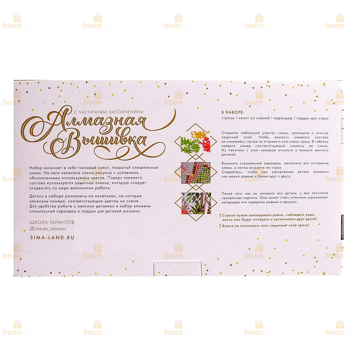 Новая серия сверкающих картин c частичным заполнением позволит создать настоящий шедевр своими руками! Разложите кристаллики с помощью карандаша по указанной схеме, заполнив полотно. Основа с точечным клеевым покрытием будет надёжно удерживать стразы. На картине уже обозначены необходимые оттенки. Часть картины предстоит заполнить стразами, другая часть напечатана на холсте-основе — такое изделие легче и быстрее создать. Поэтому набор подойдёт для тех, кто впервые пробует свои силы в этой технике или любит быстро добиваться результата. Сияющее полотно украсит любой интерьер и станет отличным подарком для близких. Комплектация холст со схемой стразы карандаш для стразов клеевая подушечка ёмкость для стразов BOON.AZ – это интернет-магазин подарков и сувениров, созданный людьми и для людей. Вспомните, сколько раз вы заходили на какой-нибудь сайт в поисках безделушки или интересной мелочи, и, безнадежно запутавшись, просто закрывали вкладку? Мы создали простой, интуитивно понятный интерфейс именно для того, чтобы вам было проще выбирать подарки. И разделили каталог на категории и разделы так, чтобы облегчить поиск. Теперь покупки в интернет-магазине станут делом легким и приятным.