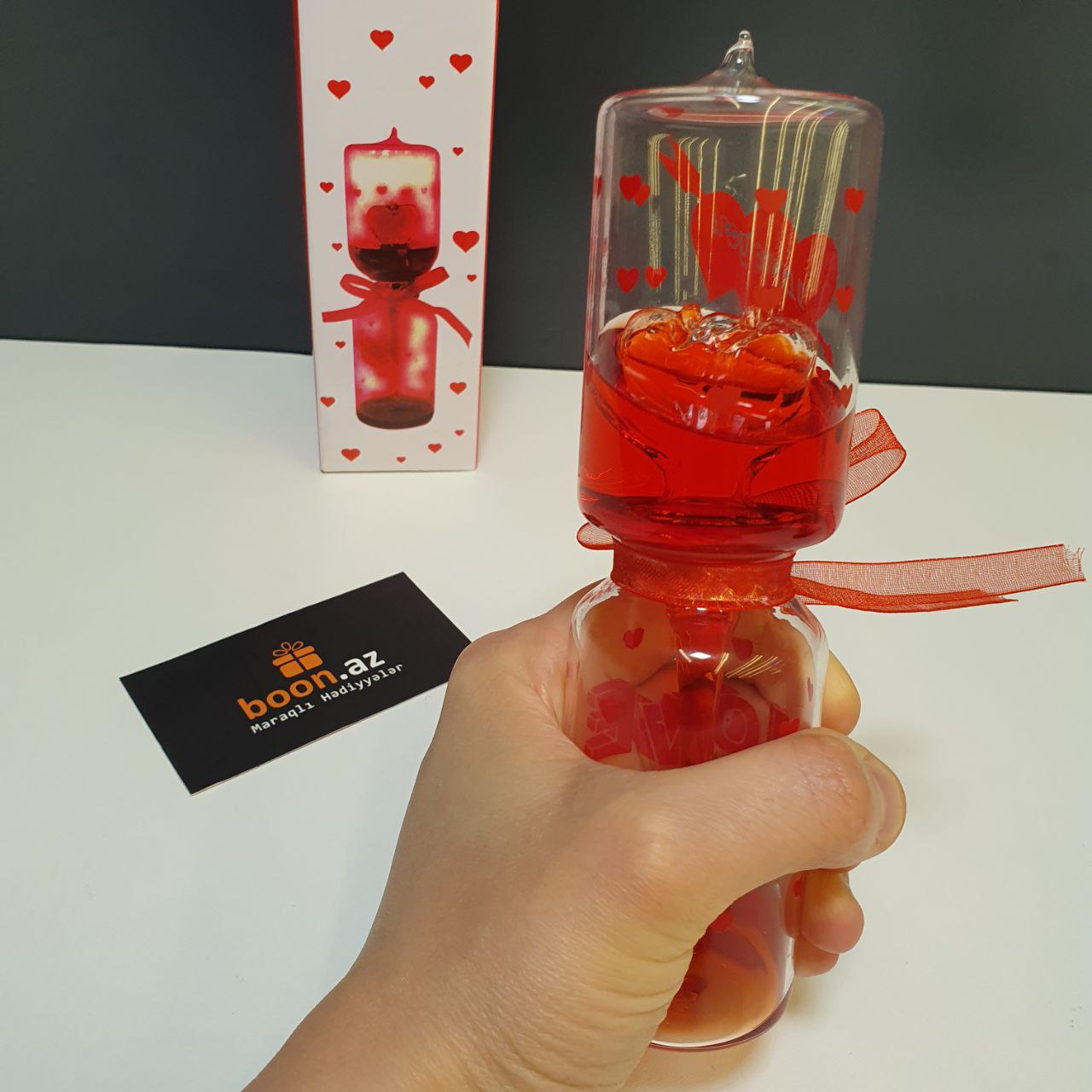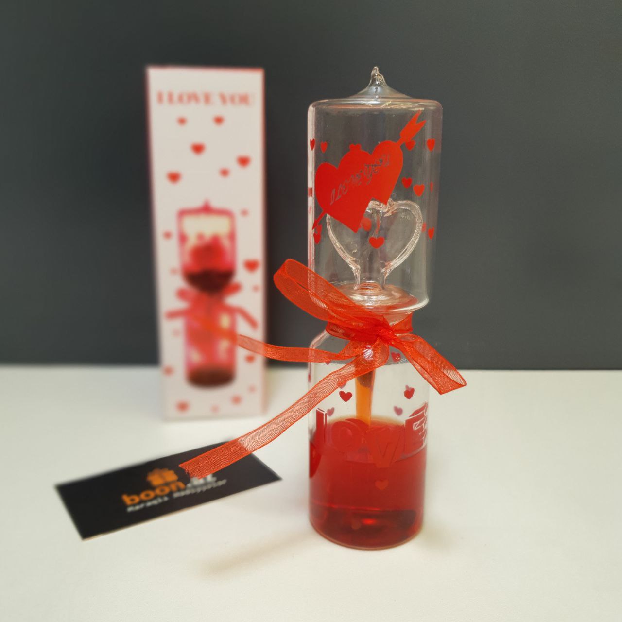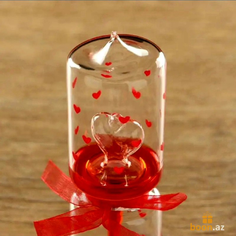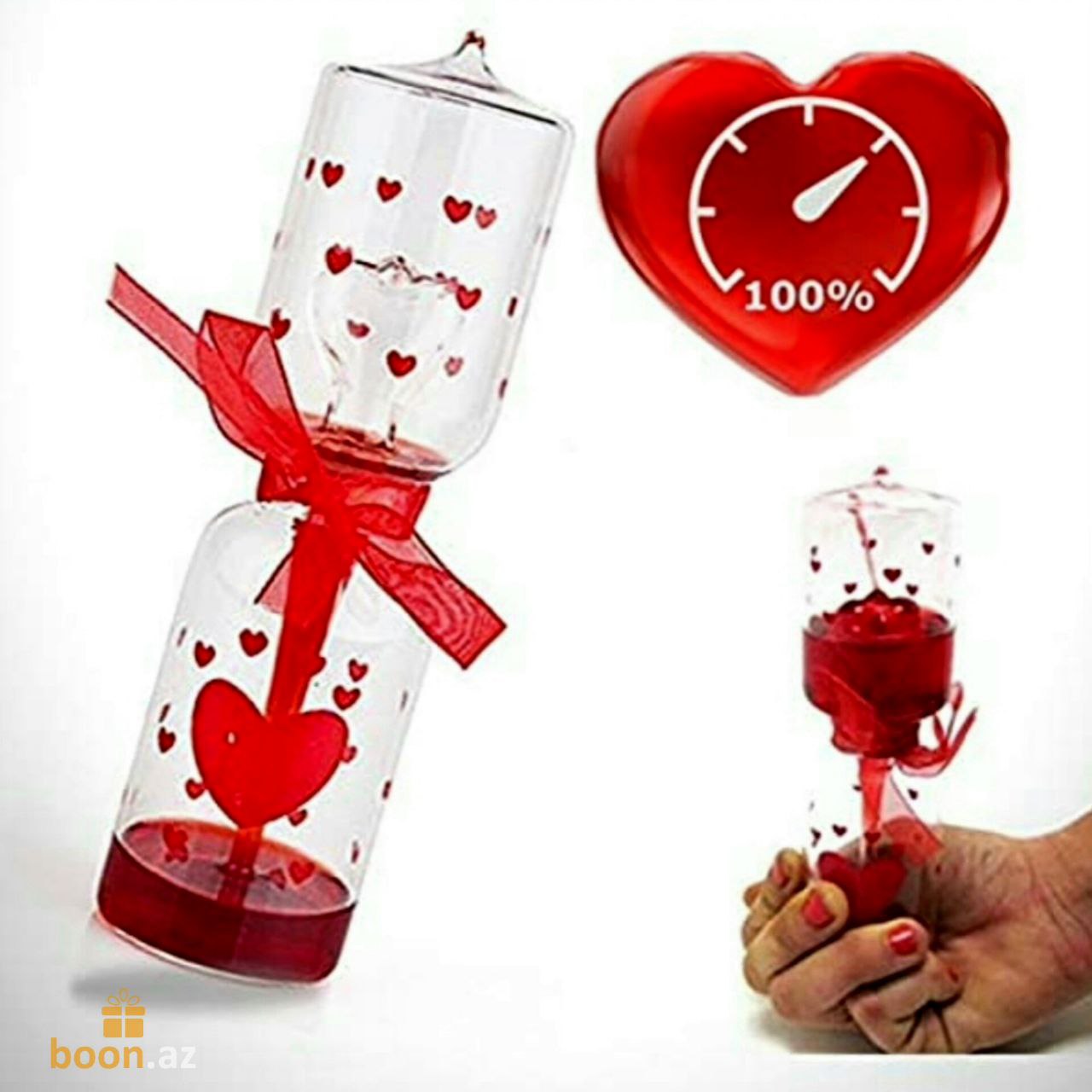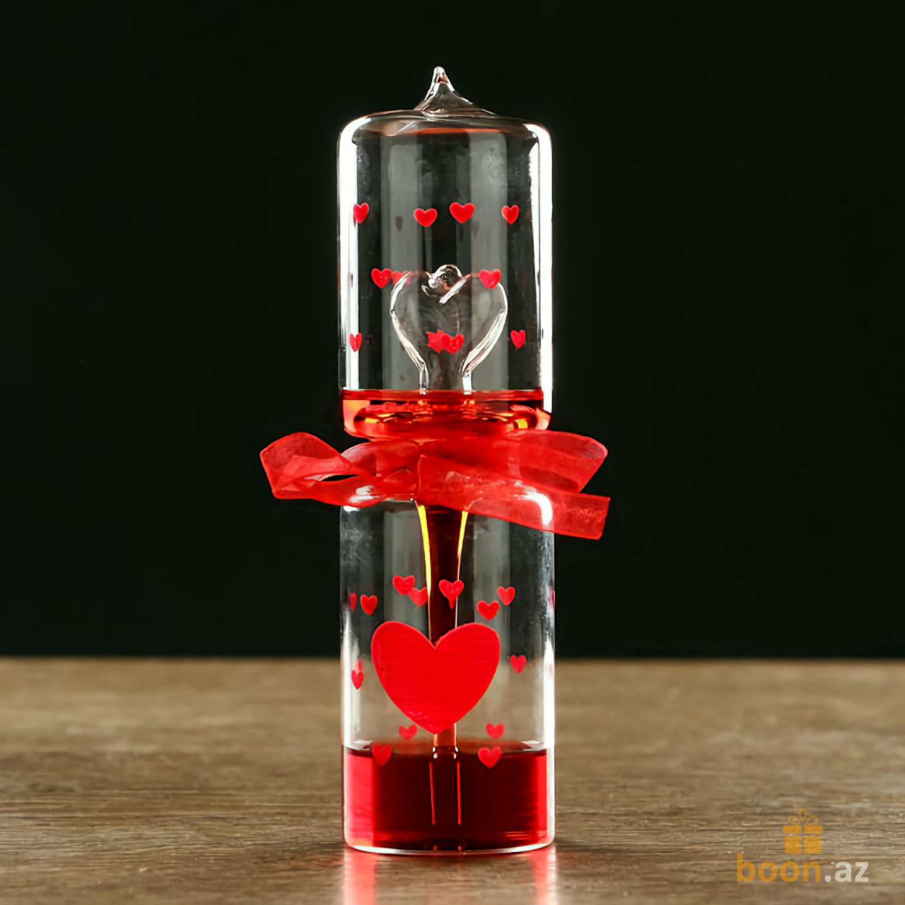 Тепловой фонтан - это самый настоящий измеритель любви. С помощью этого оригинального сувенира можно измерить насколько сильна и горяча ваша любовь. Для проведения эксперимента, необходимо зажать нижнюю часть стеклянной колбы и подождать пока жидкость, поднявшись вверх по стеклянной трубке, начнет бить фонтаном из сердечка. В самых "горячих" случаях жидкость в Измерителе любви даже закипает.