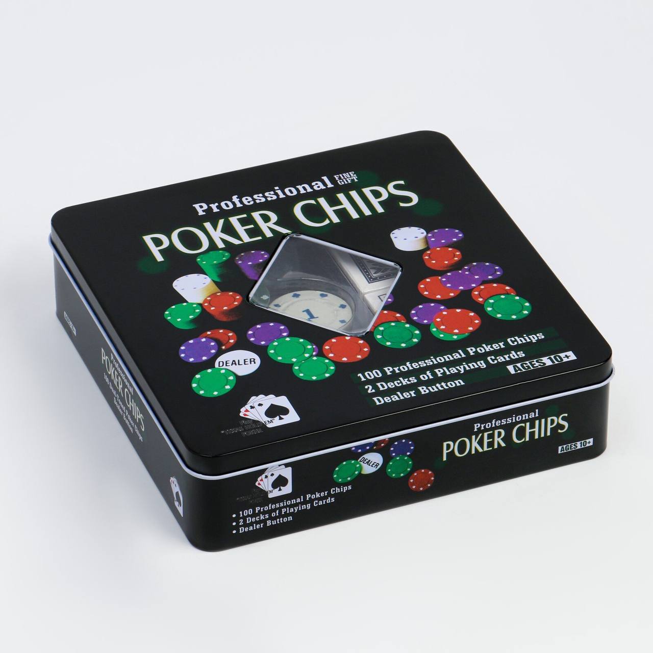 "Этот покерный набор состоит из 100 высококачественных фишек, которые заключены в металлическую коробку. Все фишки имеют стандартный диаметр и толщину, что позволяет использовать их легко и стабильно во время игры. Металлическая коробка прочна и долговечна, что обеспечивает безопасное хранение фишек. Этот набор идеально подойдет для домашних игр или неформальных игровых встреч."