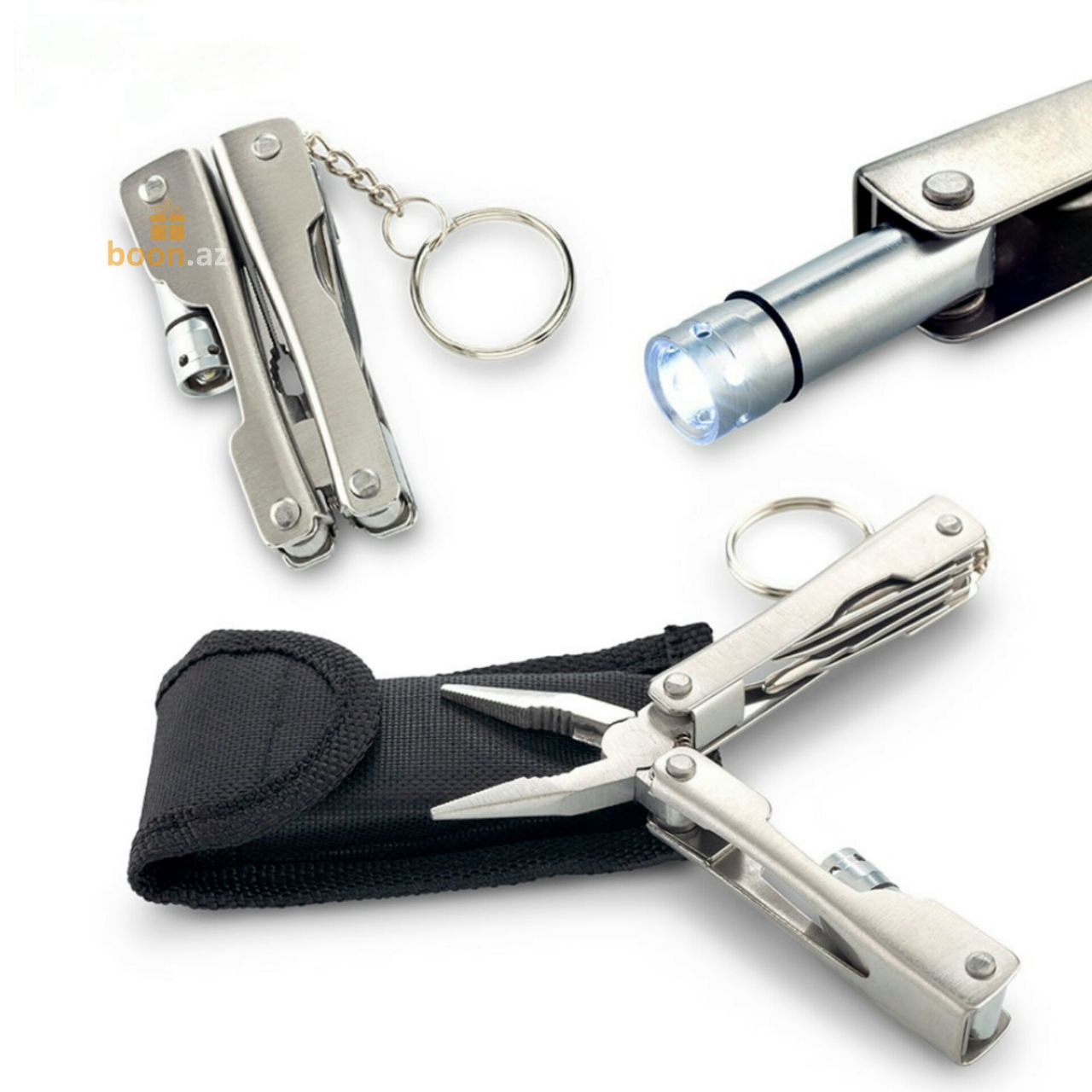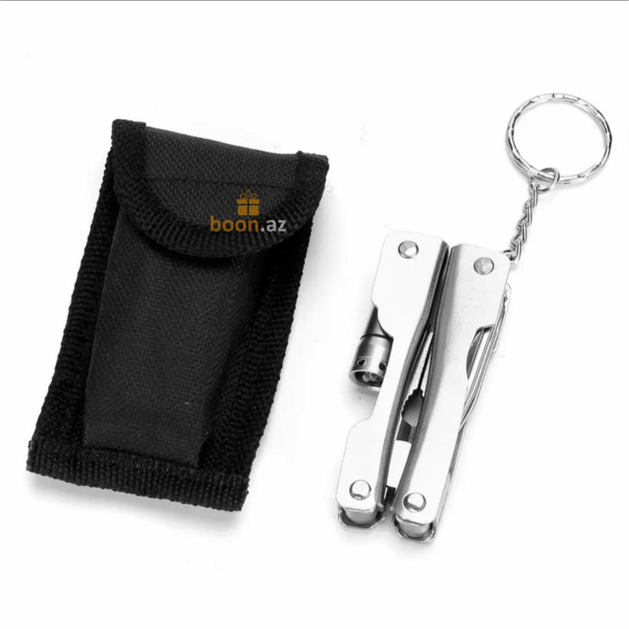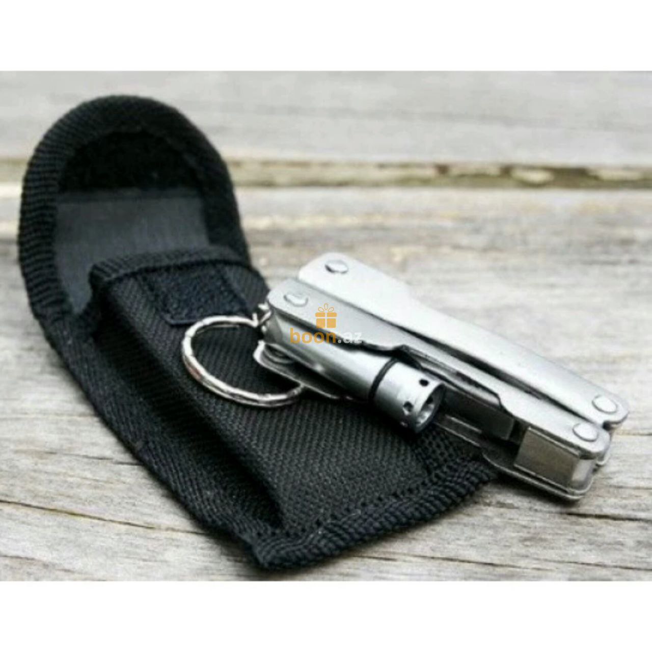 В комплект поставки мультитула 8 в 1 с фонариком входит чехол из прочной ткани, которую легко чистить от различных загрязнений. Чехол можно прикрепить к ремню за счет специального ремешка. Имеется прочная цепочка с кольцом для переноски набора на ключах, карабинах и пр.