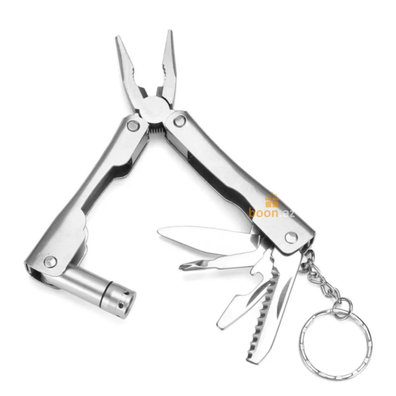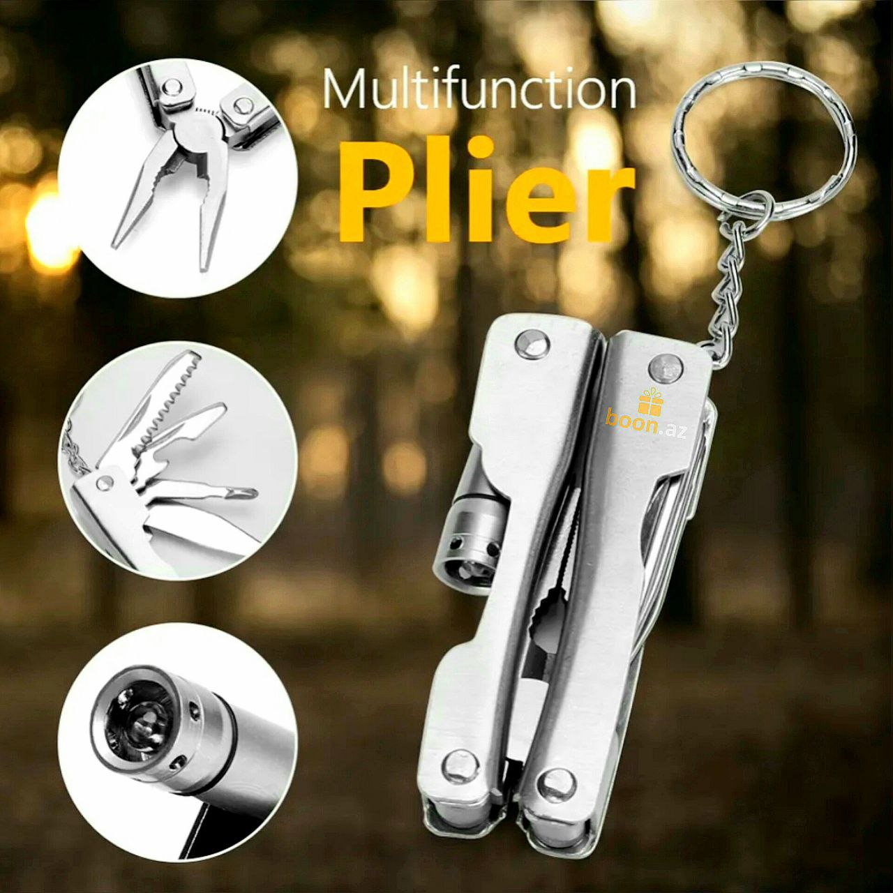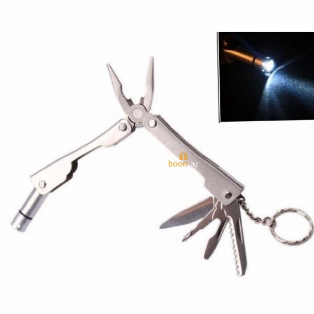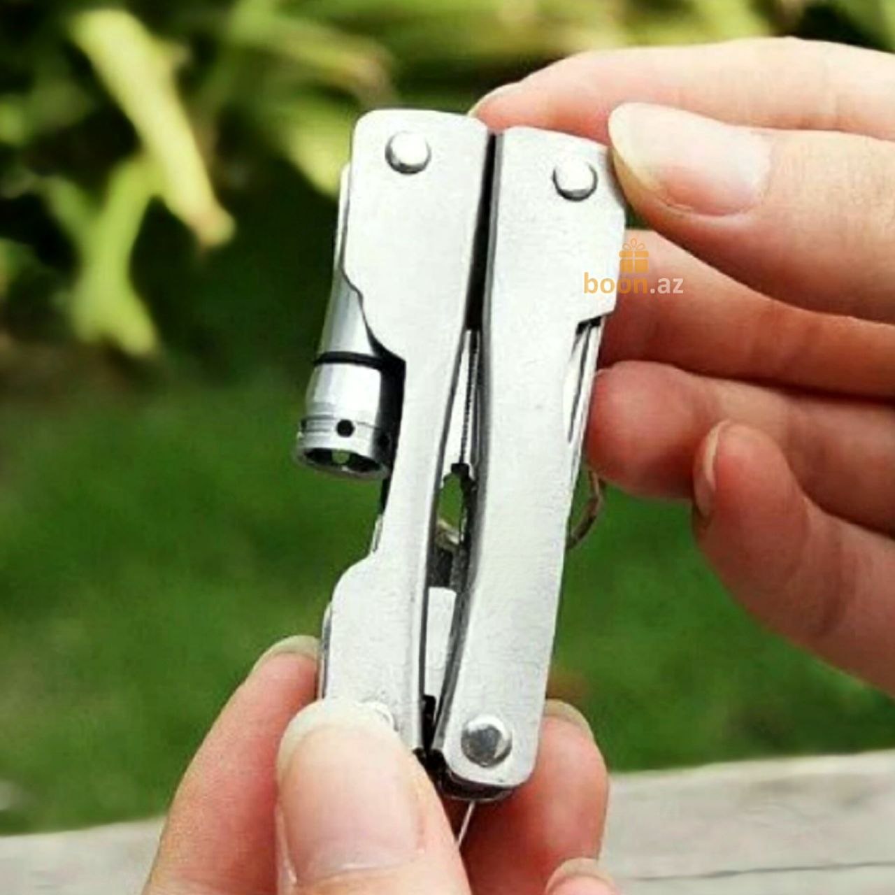 В комплект поставки мультитула 8 в 1 с фонариком входит чехол из прочной ткани, которую легко чистить от различных загрязнений. Чехол можно прикрепить к ремню за счет специального ремешка. Имеется прочная цепочка с кольцом для переноски набора на ключах, карабинах и пр.