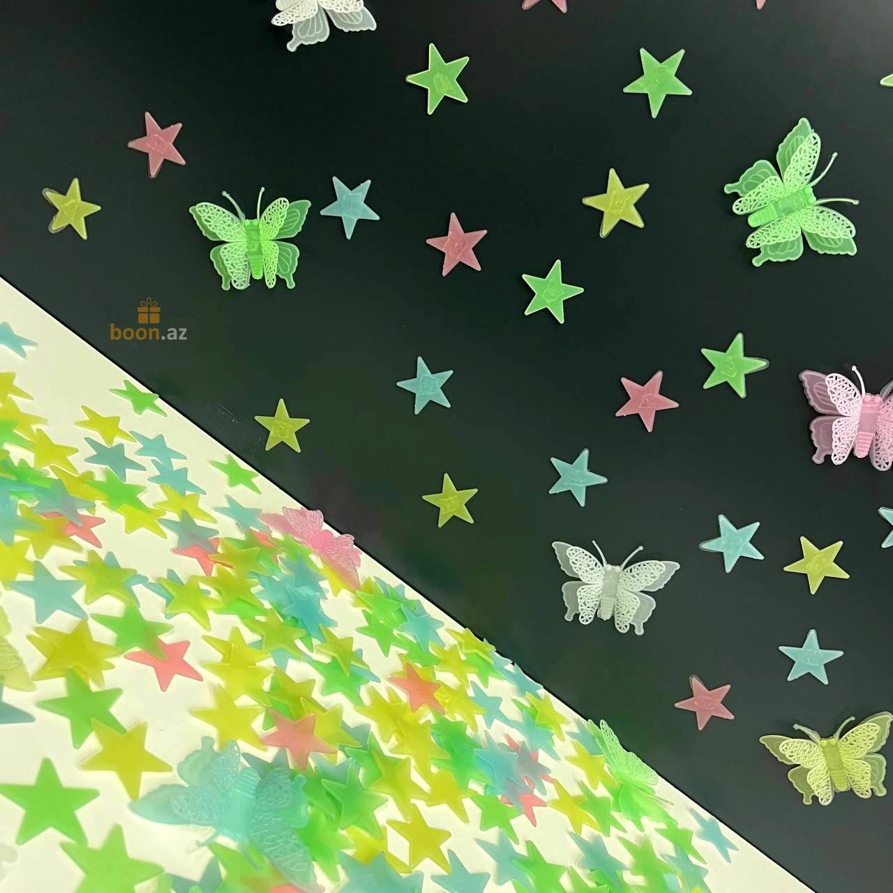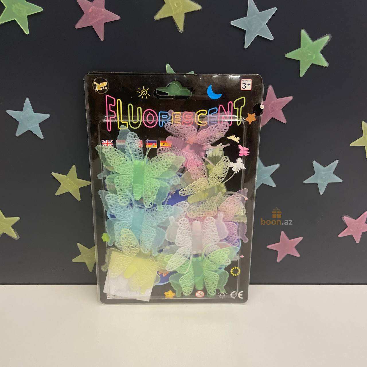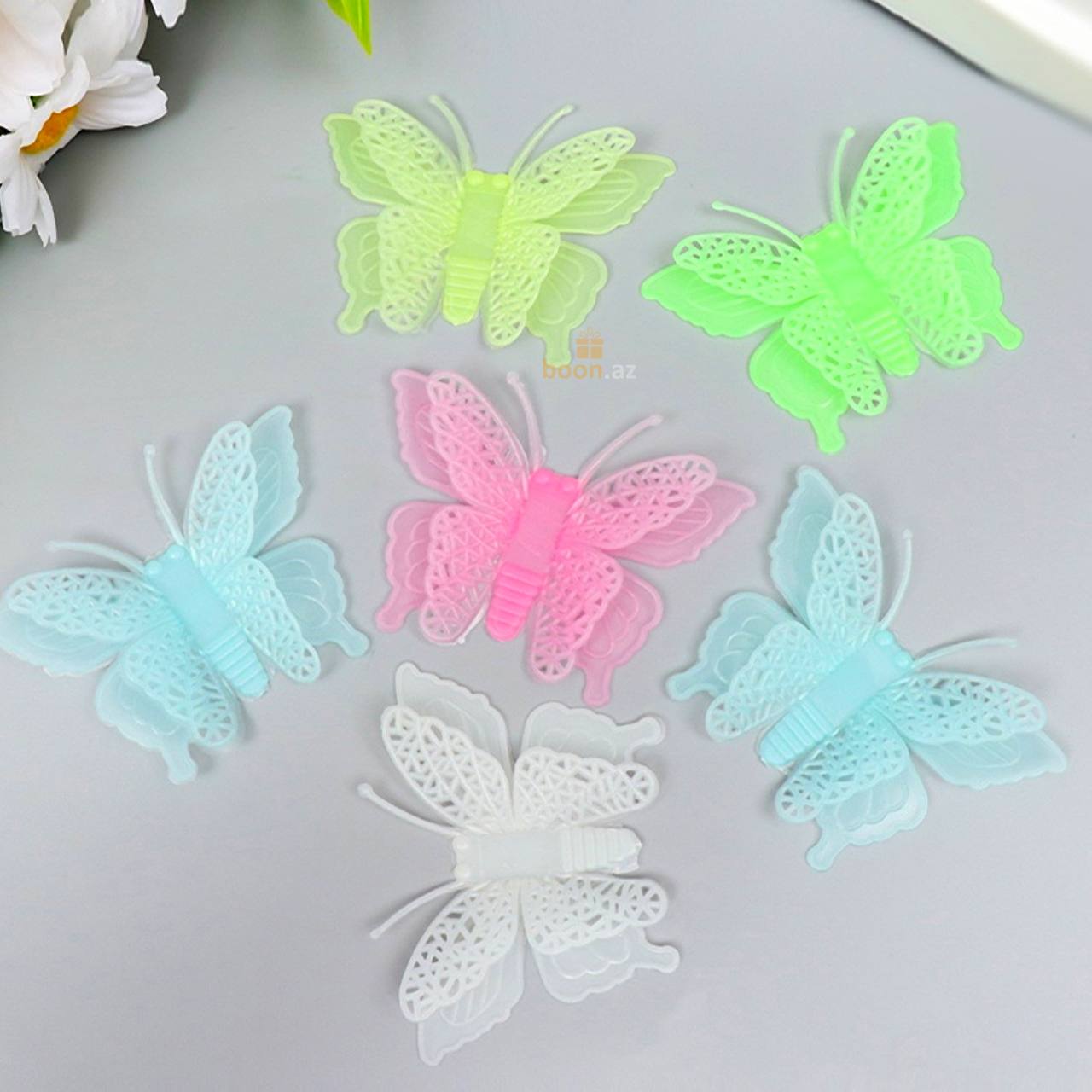 Цвет бабочек: зеленый, розовый, синий, желтый.