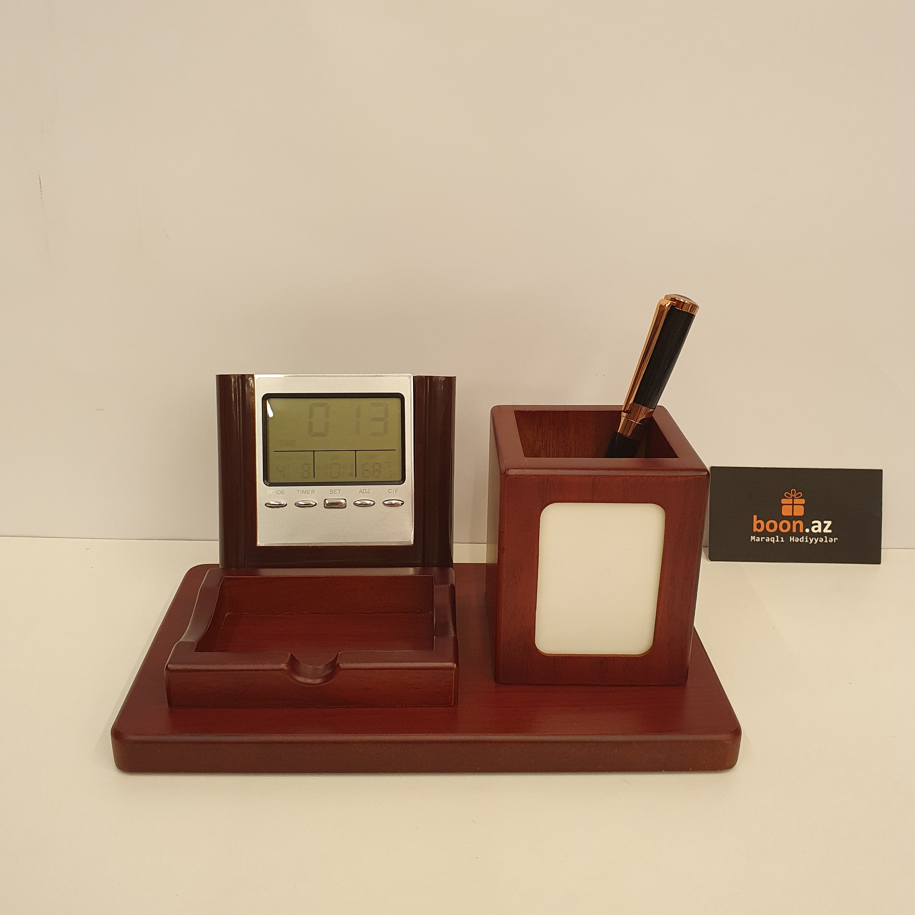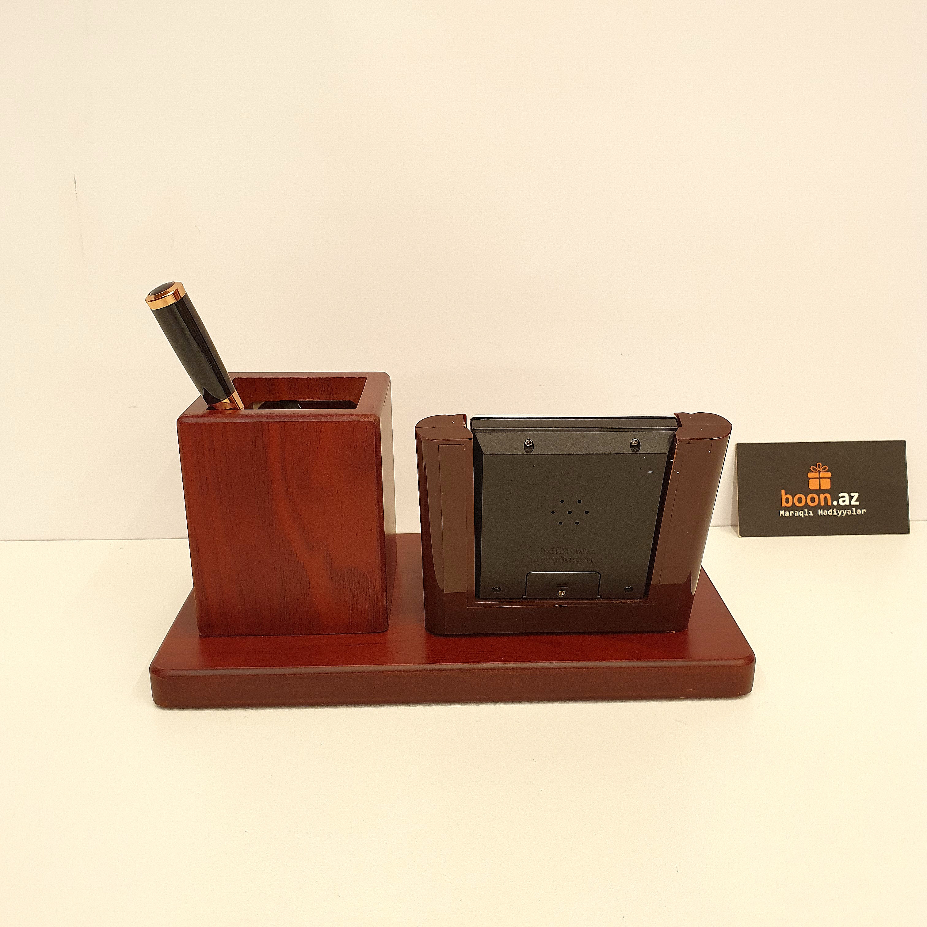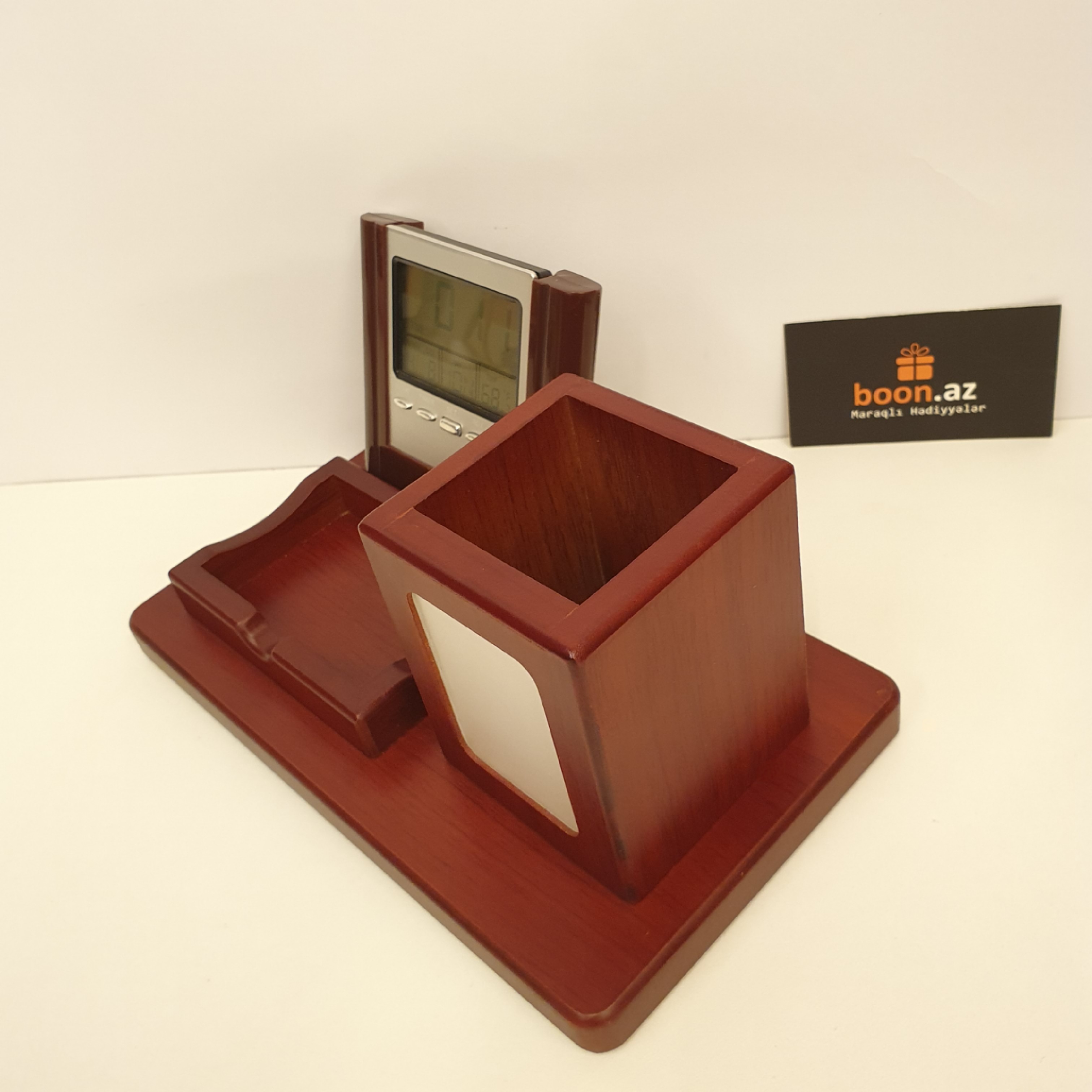 Порой рабочий стол настолько загружен, что негде расписаться или составить документ от руки. А на большинство людей беспорядок действует негативно, снижает концентрацию и продуктивность. Компактный настольный набор поможет избежать хаоса на рабочем месте. Храните в нём канцелярские принадлежности или другие мелочи, чтобы правильно организовать пространство. К тому же изделие имеет минималистичный дизайн и выполнено под дерево, поэтому оно украсит собой любое место как декоративный элемент. С помощью такого аксессуара можно поздравить сотрудников, руководство, деловых партнёров, также он подойдёт в качестве подарка учителям и преподавателям.